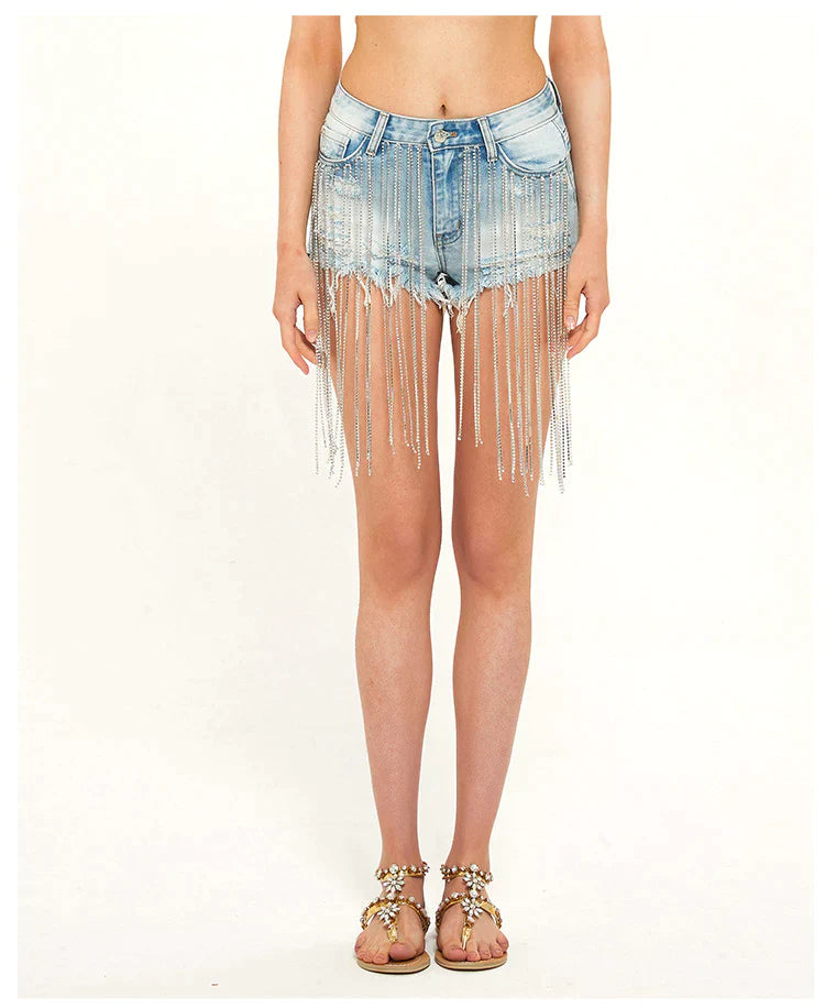 The perfect pair of shorts for the adventurous at heart. Metal decorations echo the allure of the open road, while long tassels flutter in the wind. Hand-worn, light blue denim ensures durability and comfort, making them the perfect choice for any journey, whether it’s a motorcycle ride down the coast or a night out on the town.
