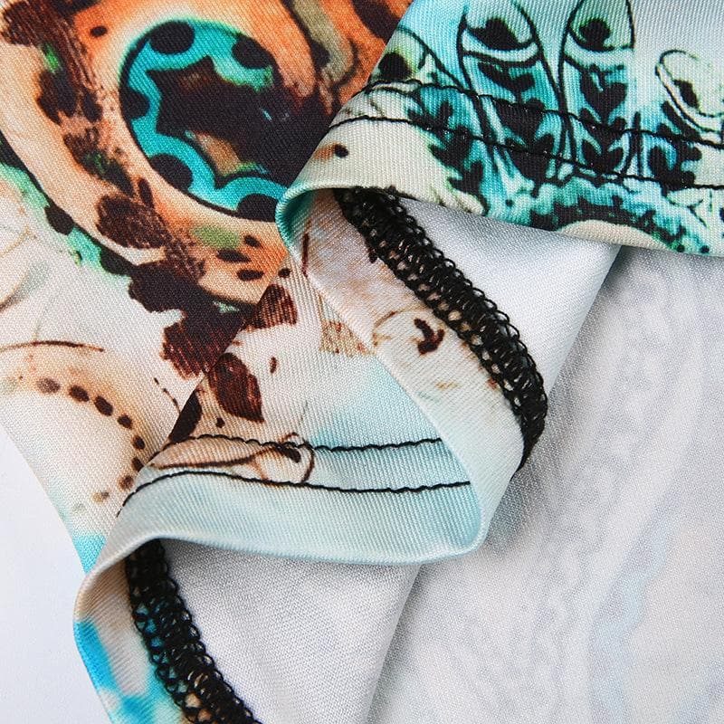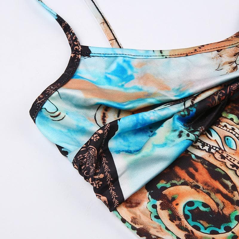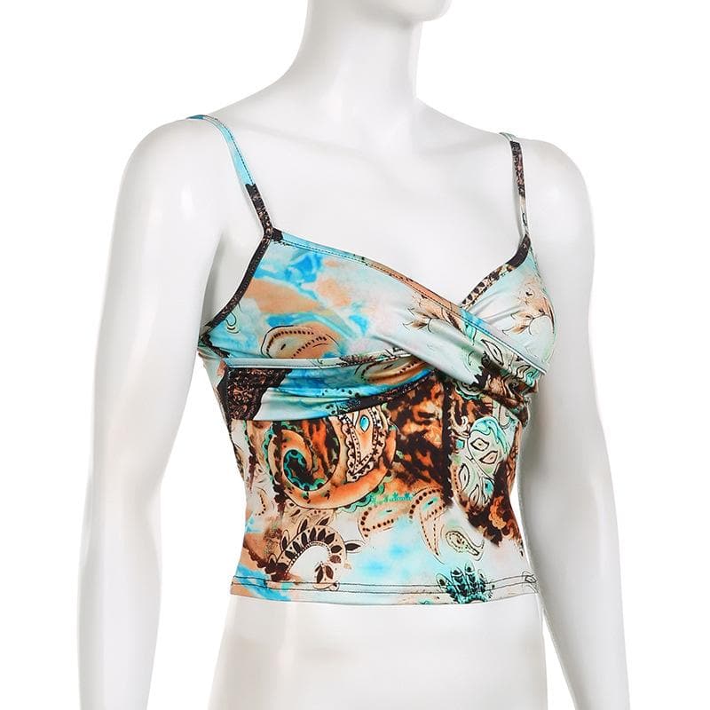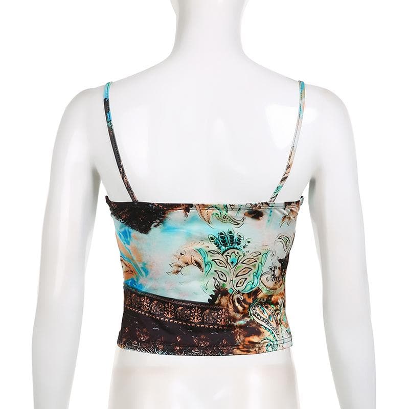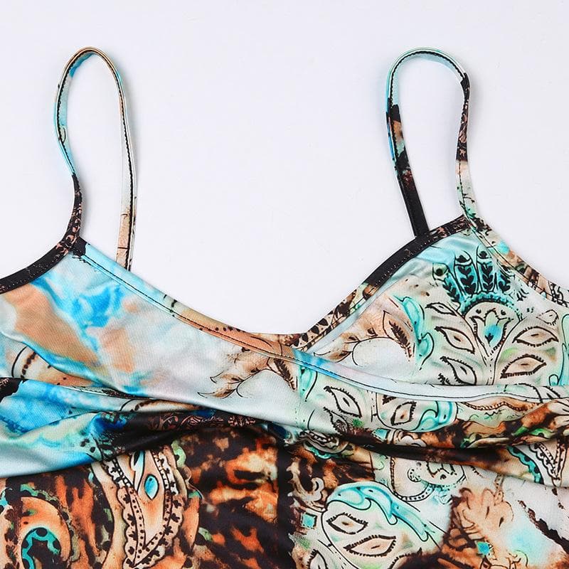 Abstract print ruched contrast v neck backless cami crop top - Final Sale