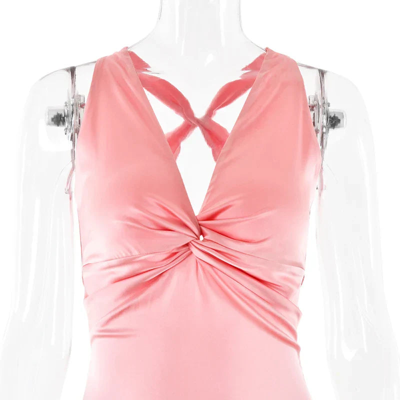 V Neck Sleeveless Satin Bow Backless Maxi Dress