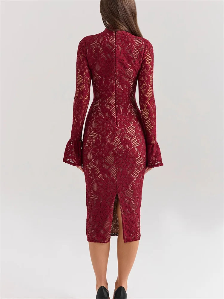 V-Neck Hollow Out Long Sleeve Black Lace Maxi Dress