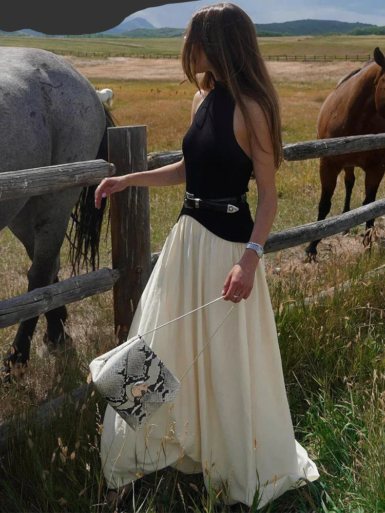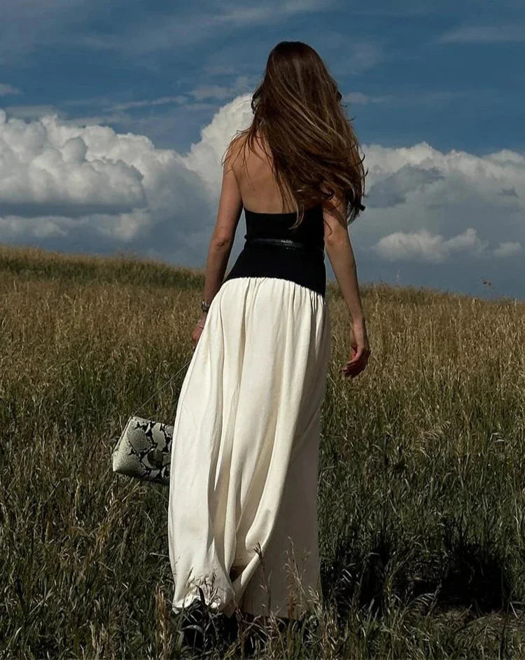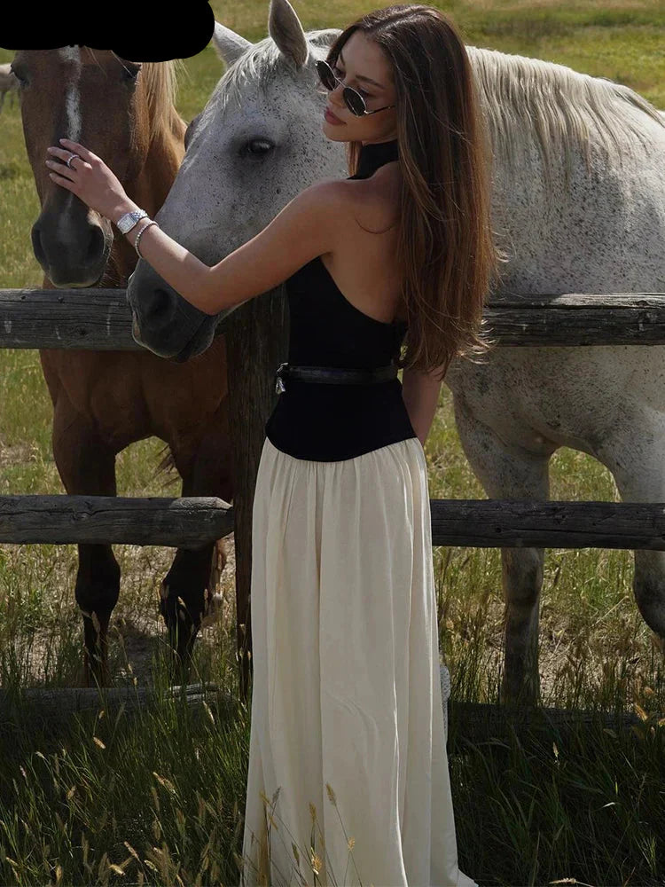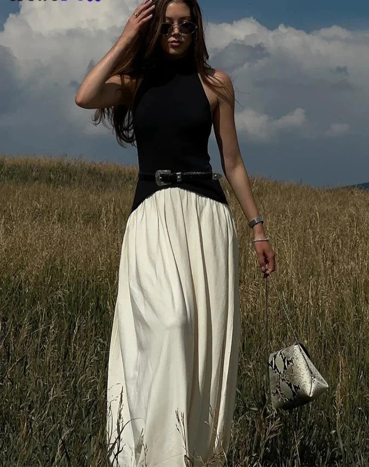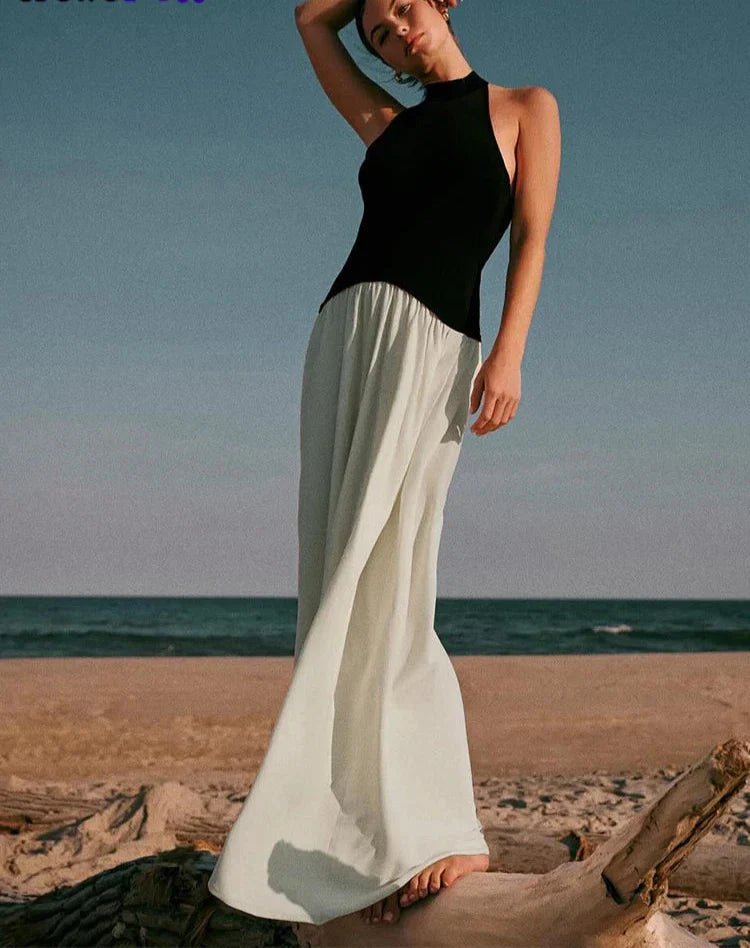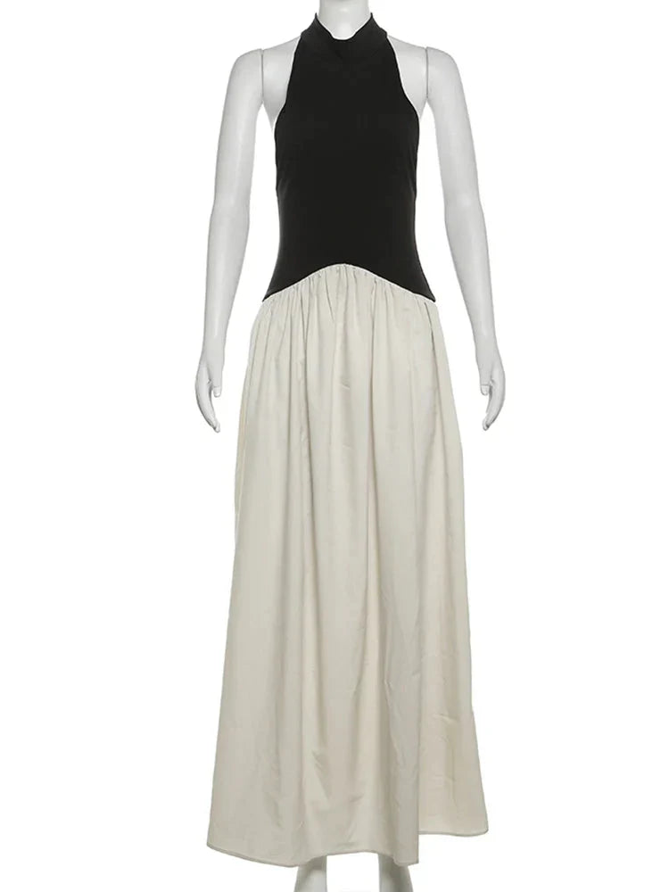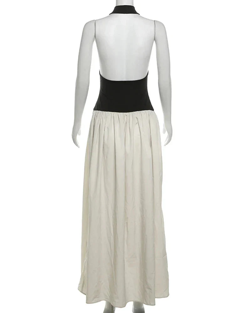 Contrast Patchwork Halter Backless Long Bodycon Dress