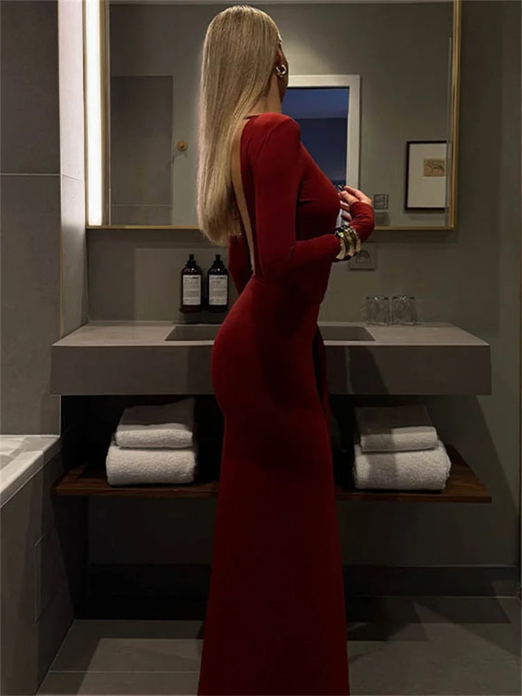Red Lace-Up Pleated Long Sleeve Maxi Dress