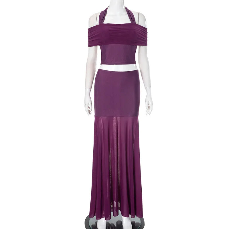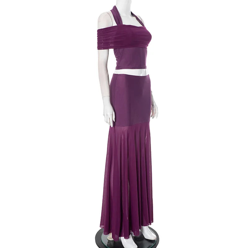 Purple Mesh Two-Piece Set with Sheer Halter Top and Long Skirt