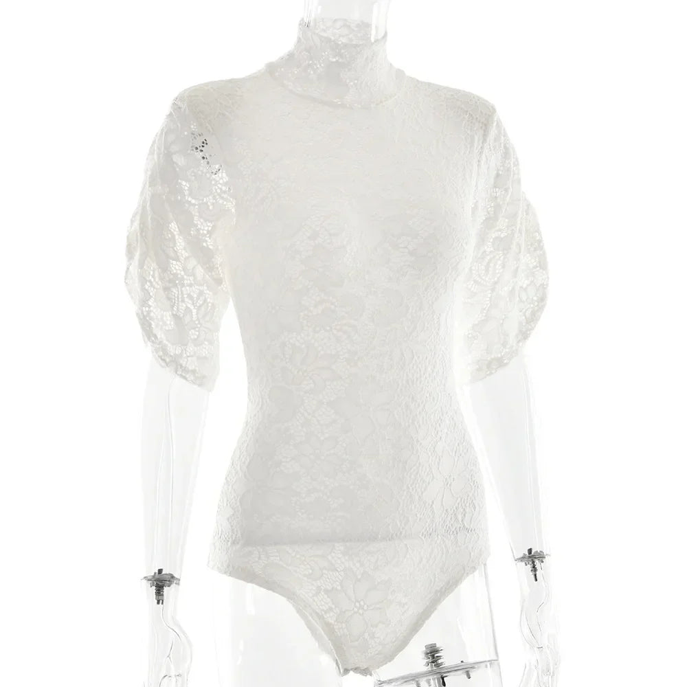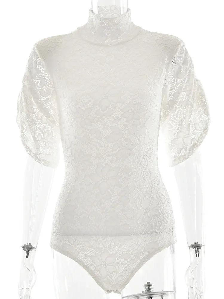 Turtleneck Lace Short Sleeve Shoulder Pads Bodysuit
