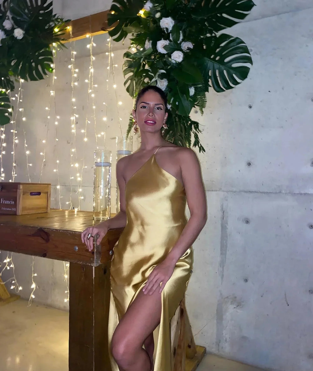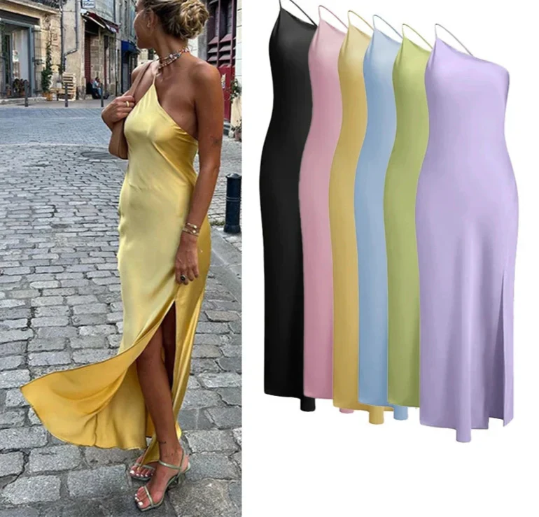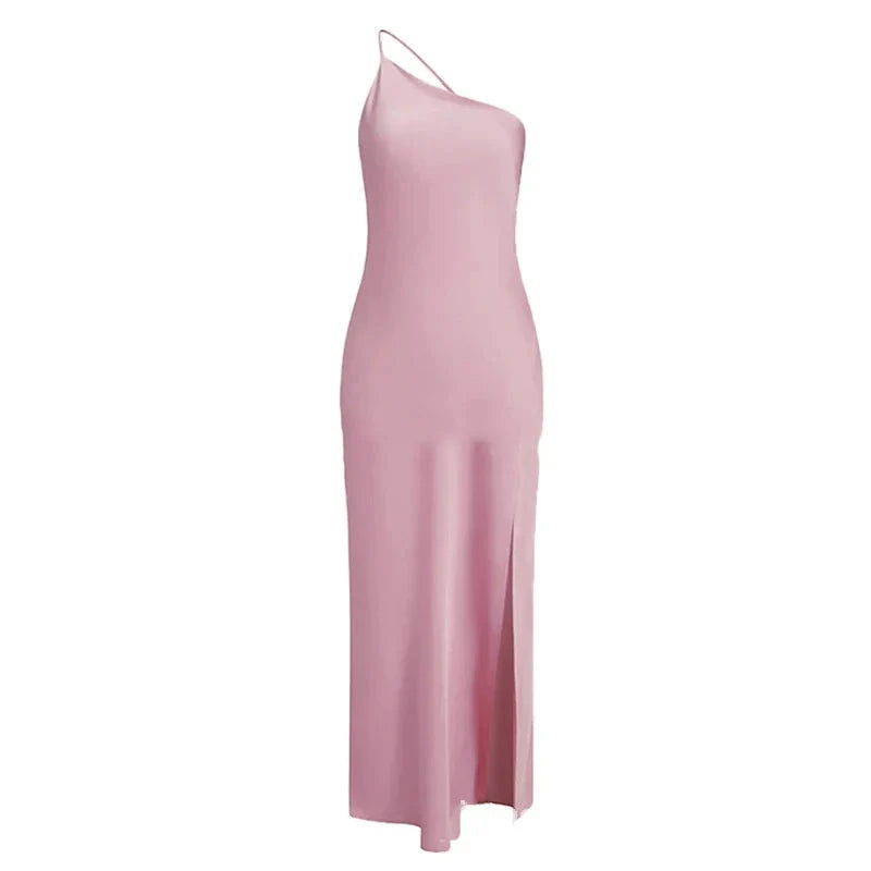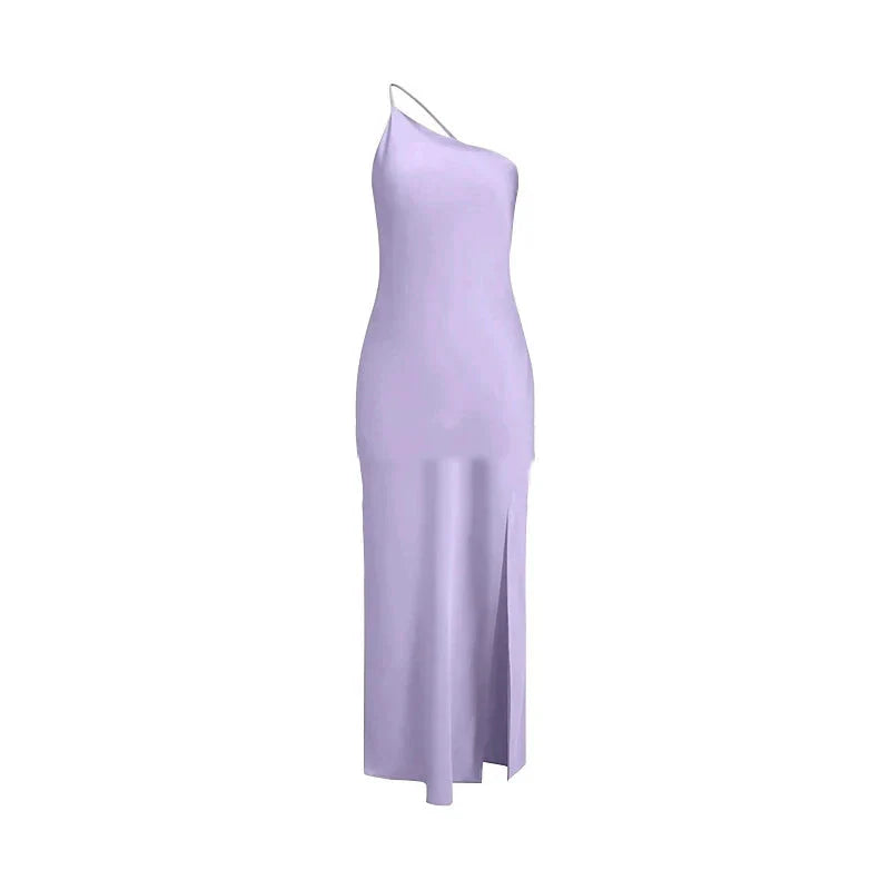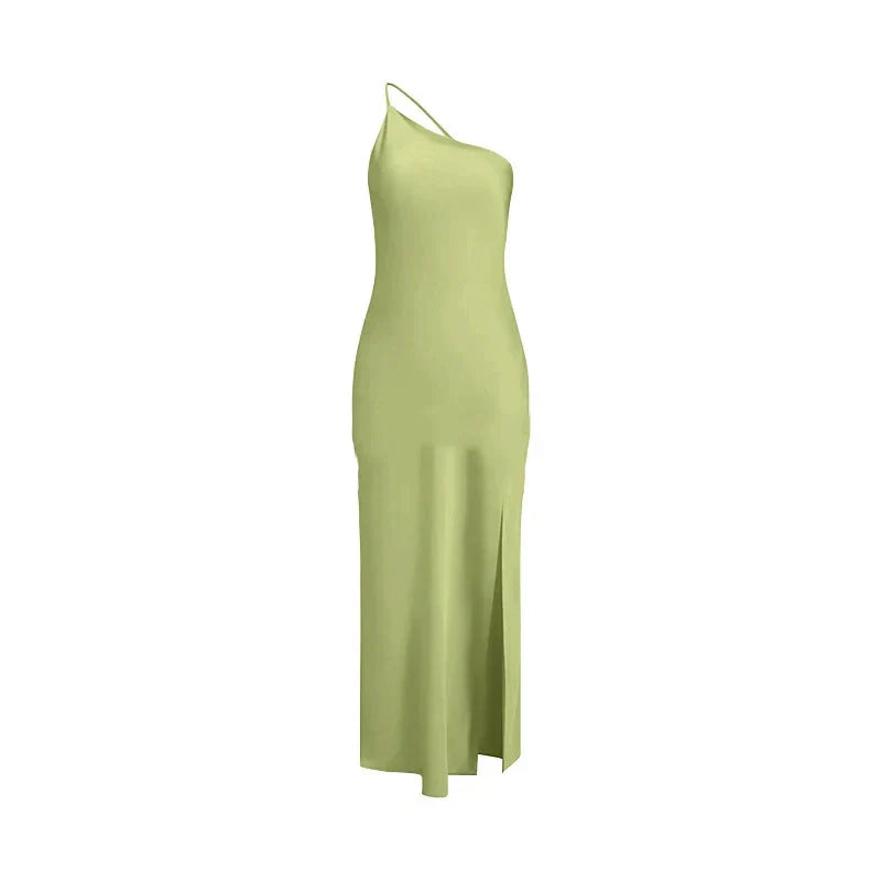 Backless Satin Slant Shoulder Solid Slit Long Dress