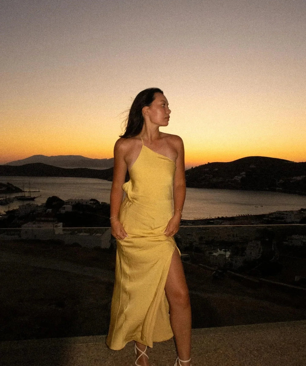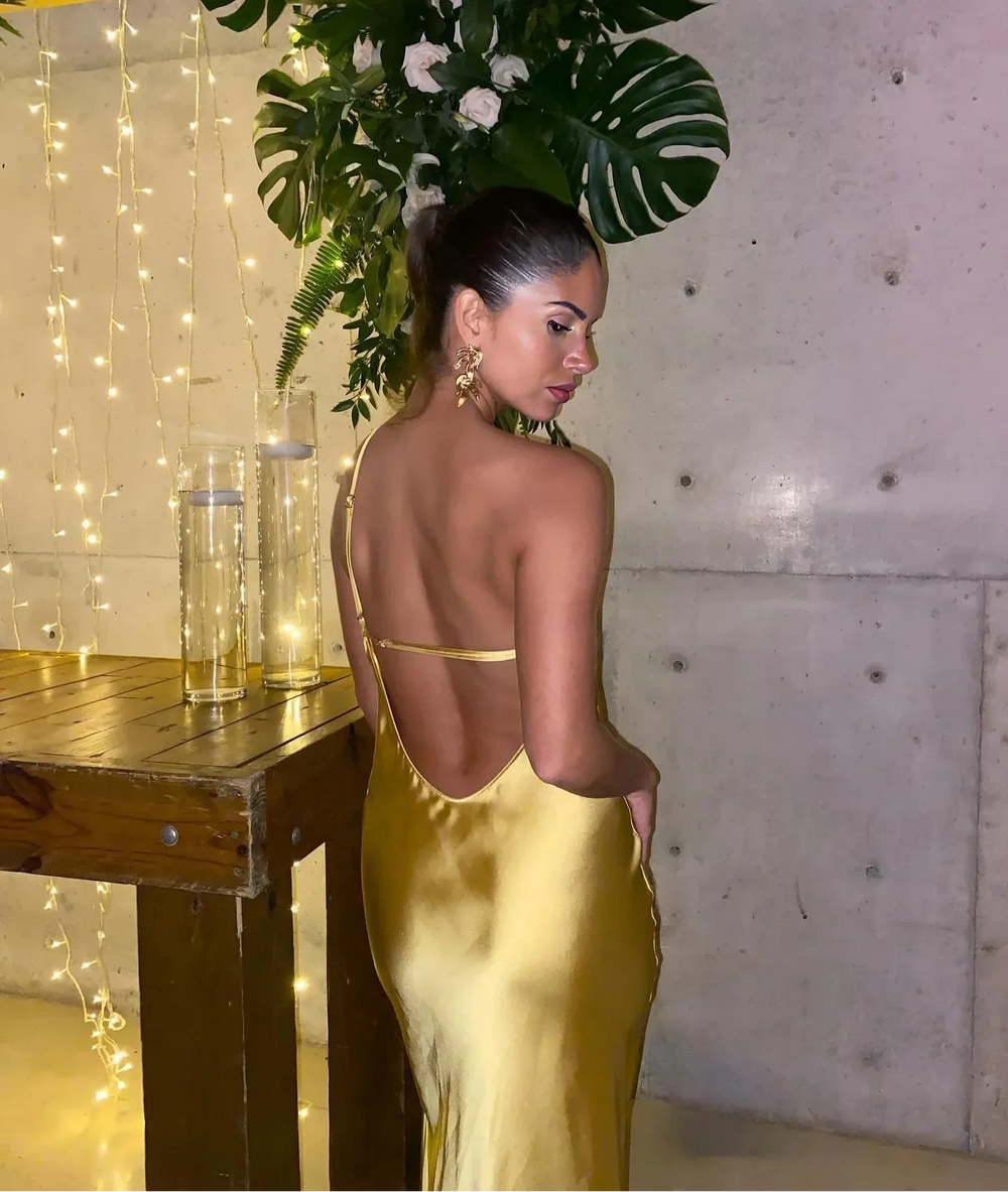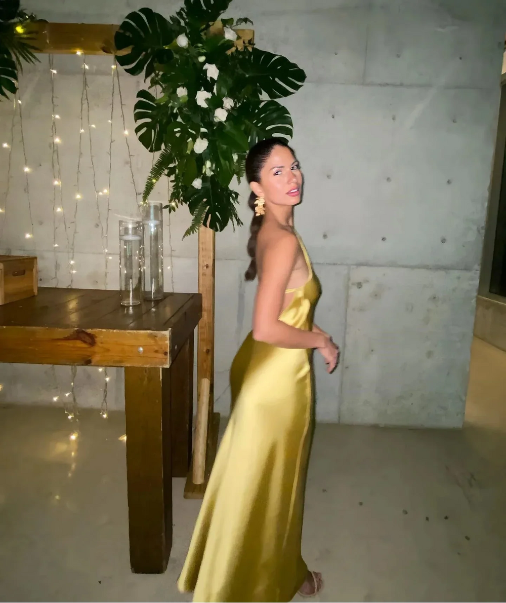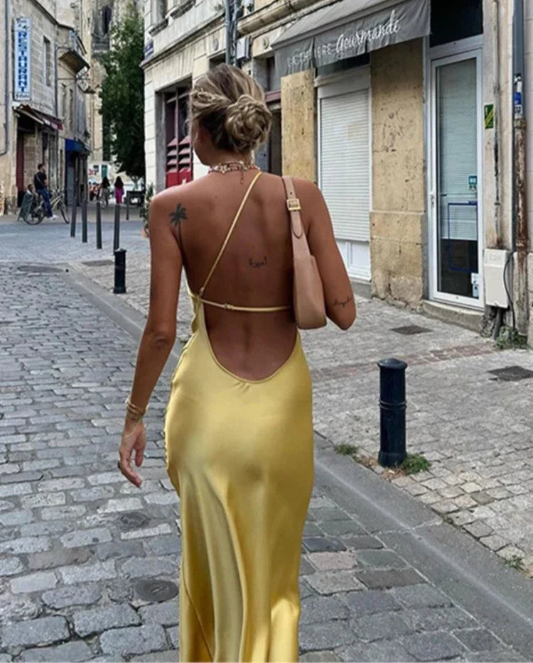 Backless Satin Slant Shoulder Solid Slit Long Dress