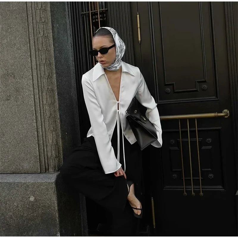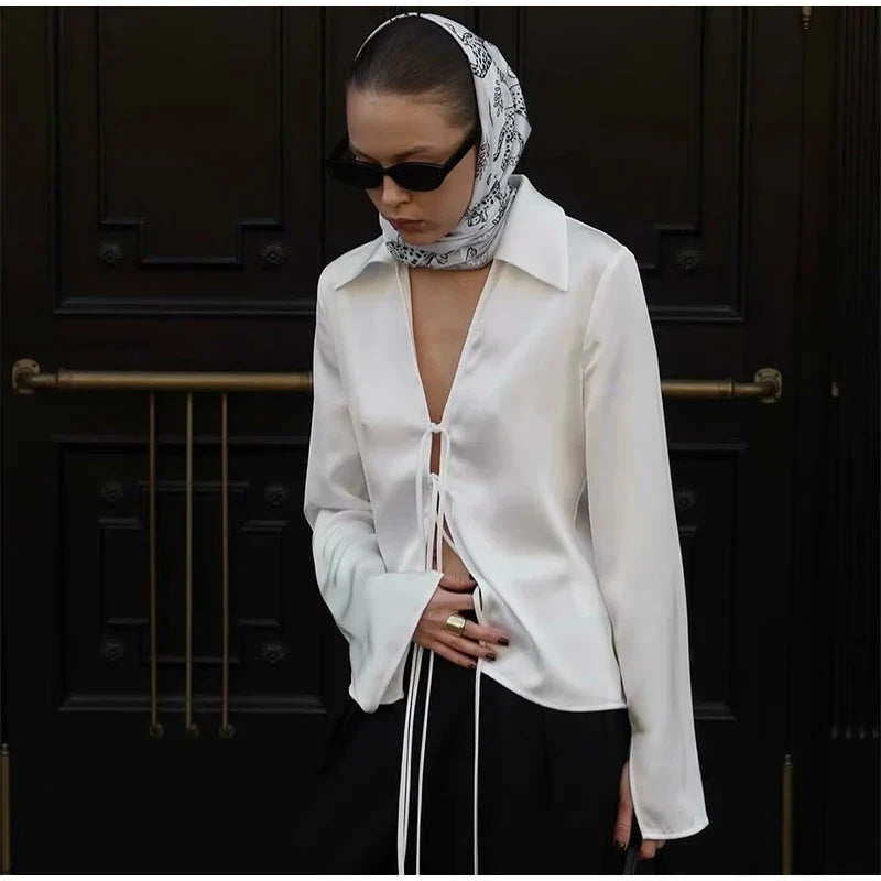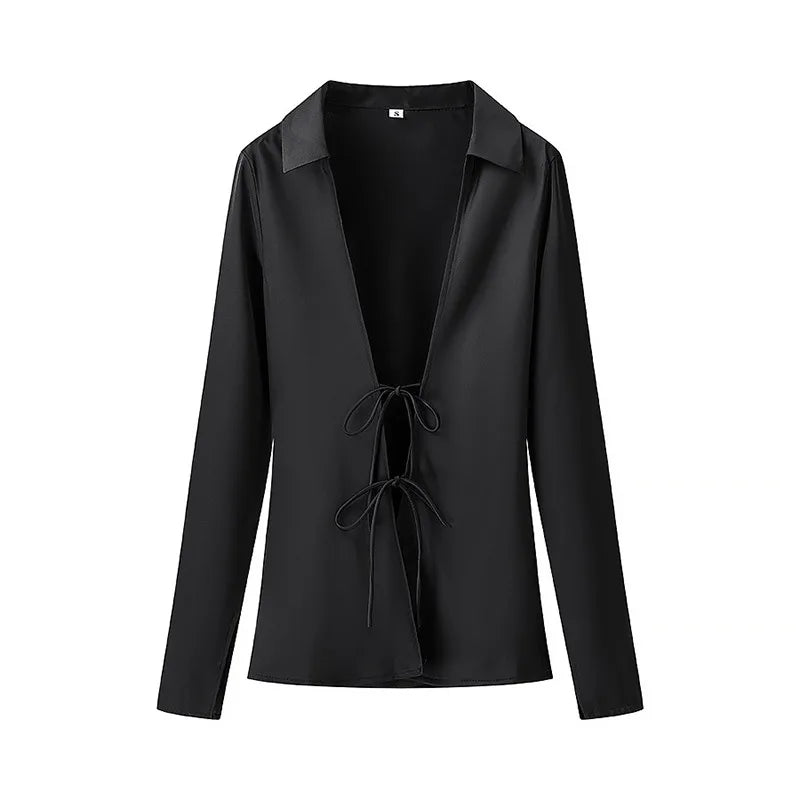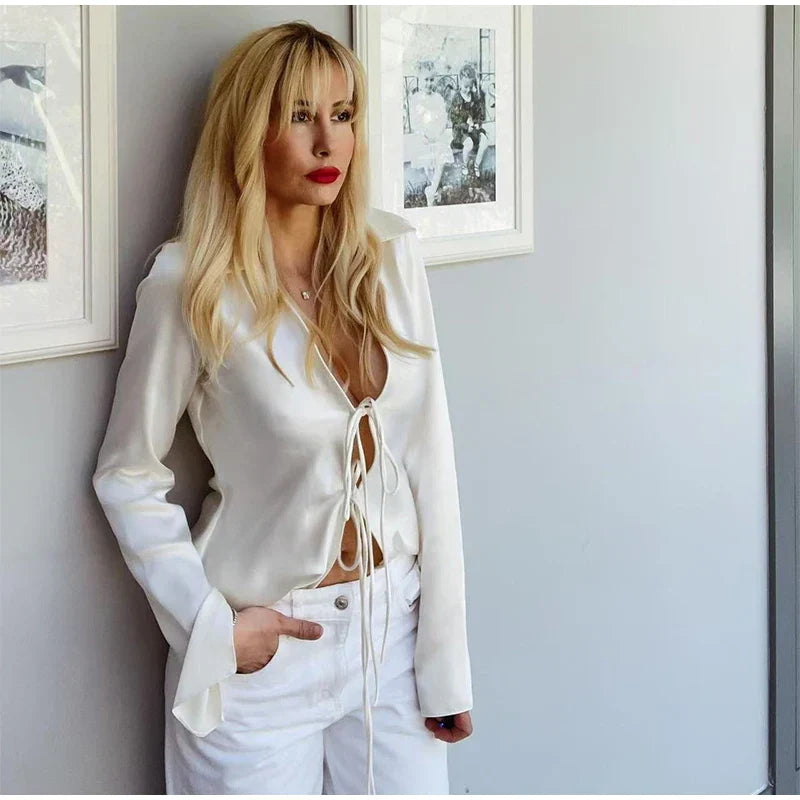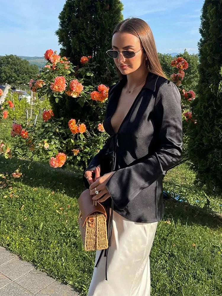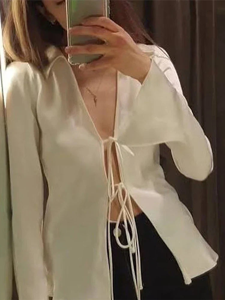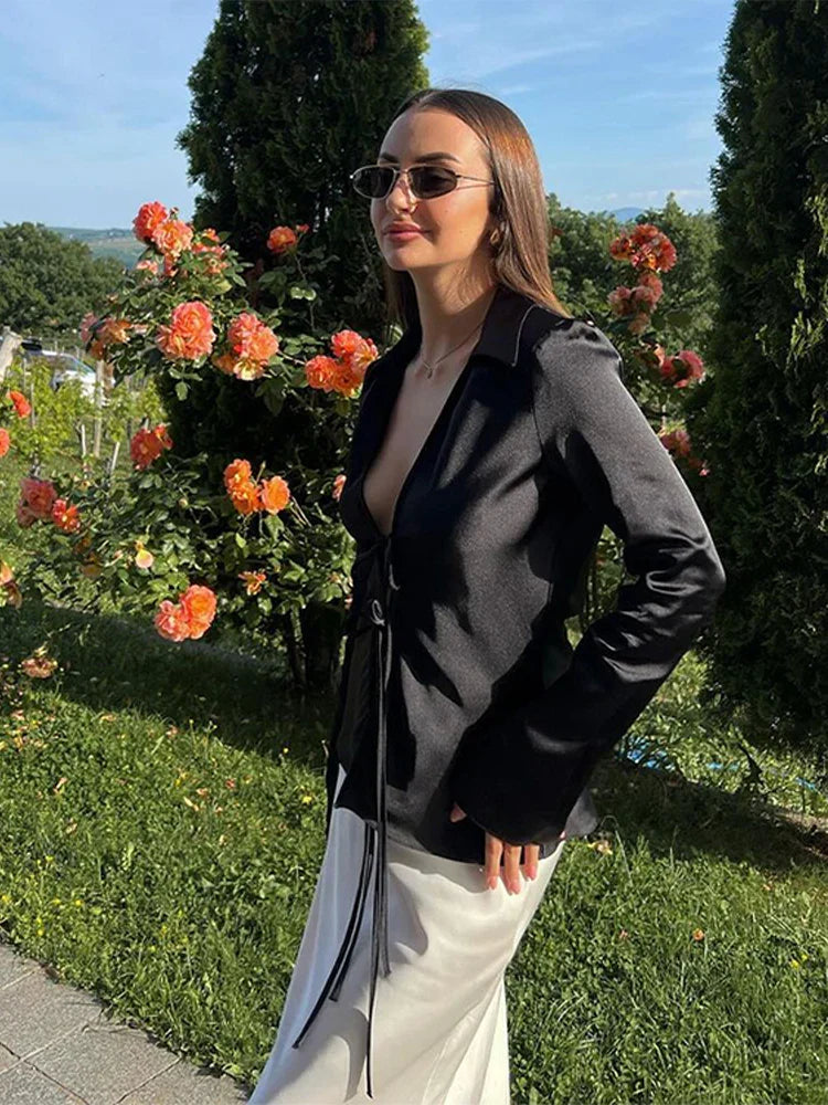 • Model Number: Elegant Satin Deep V-neck Lace Up Shirts