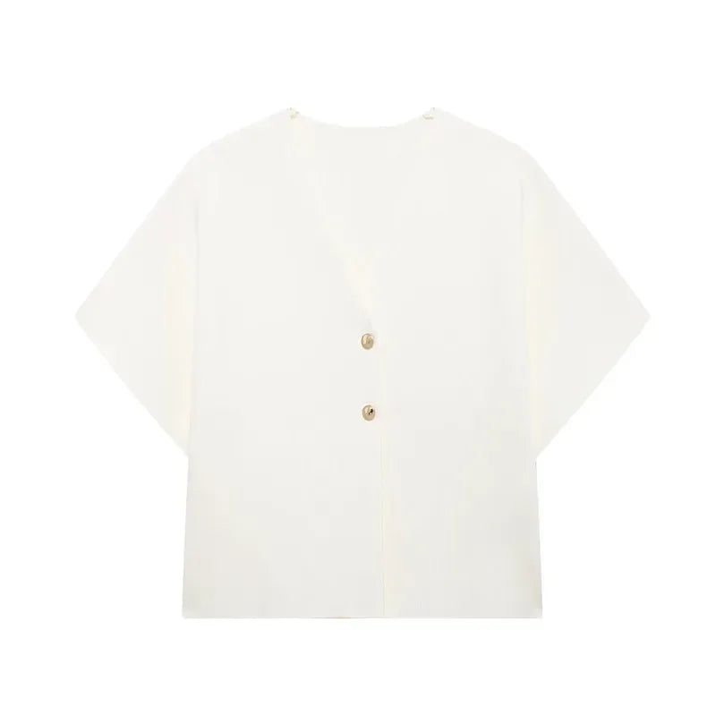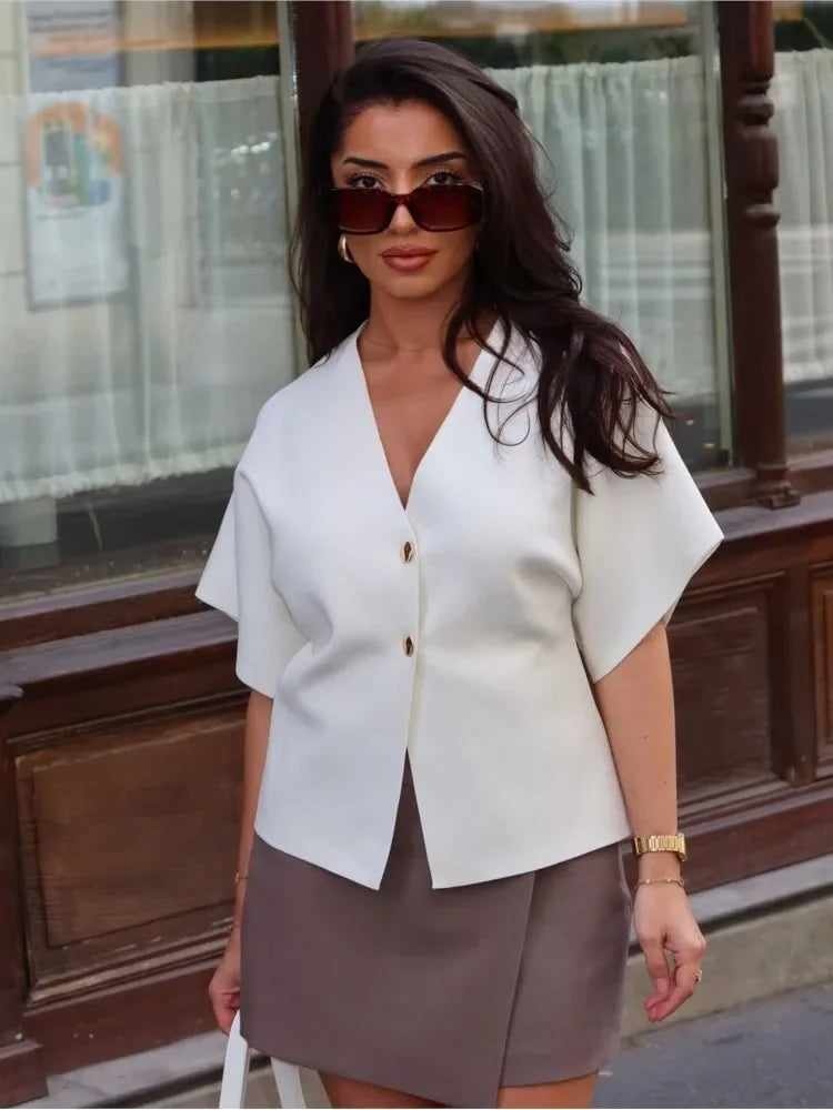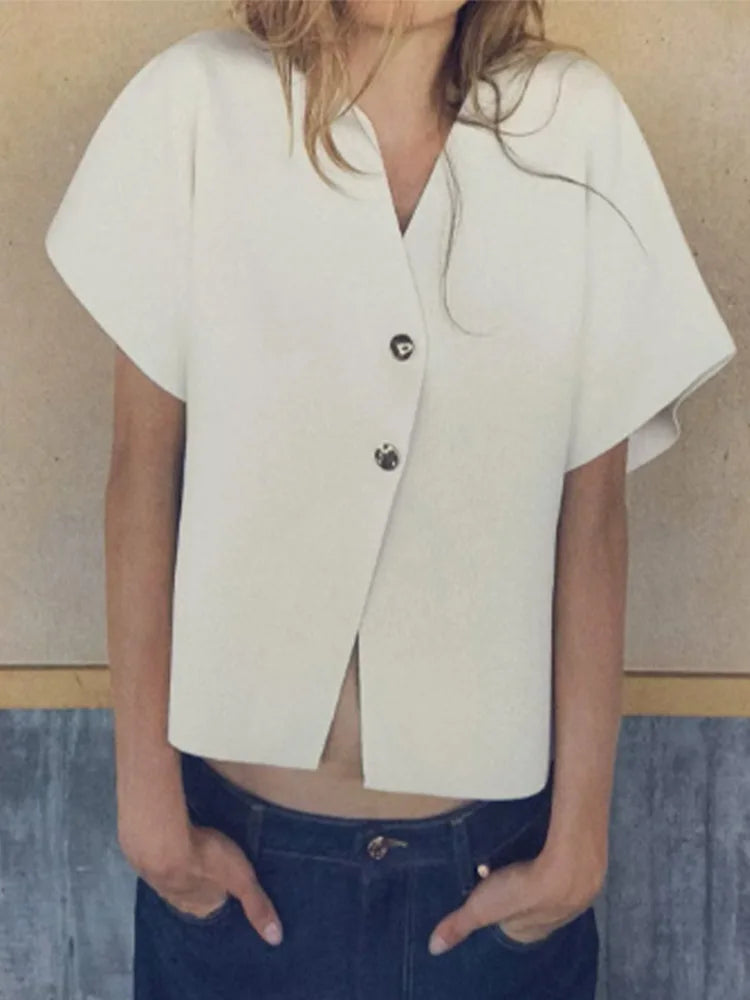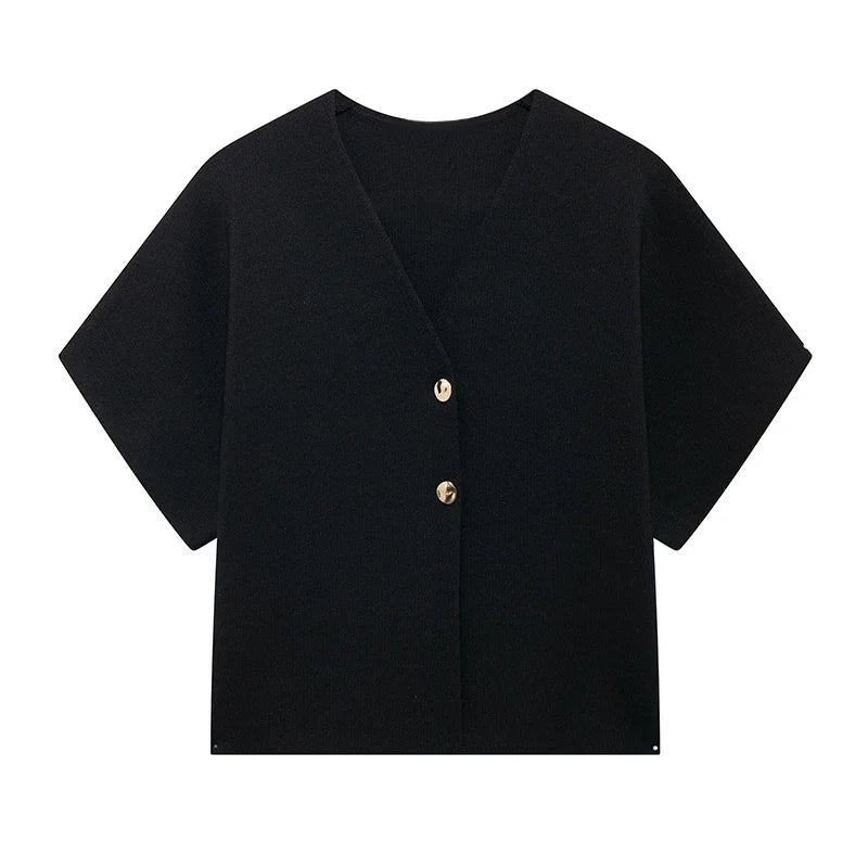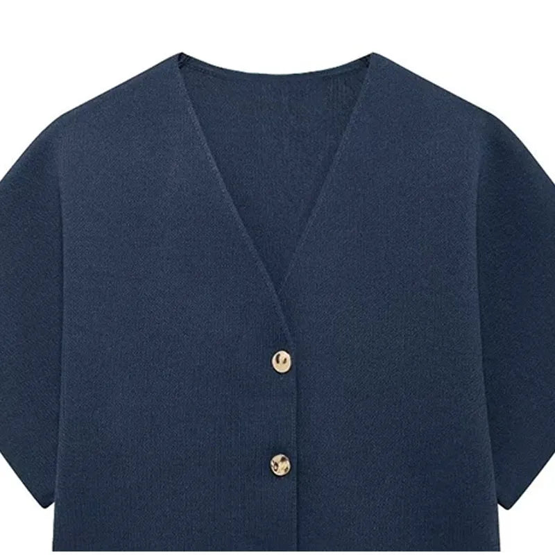 Knitted Flat Pin V-Neck Solid Short Sleeved Tops