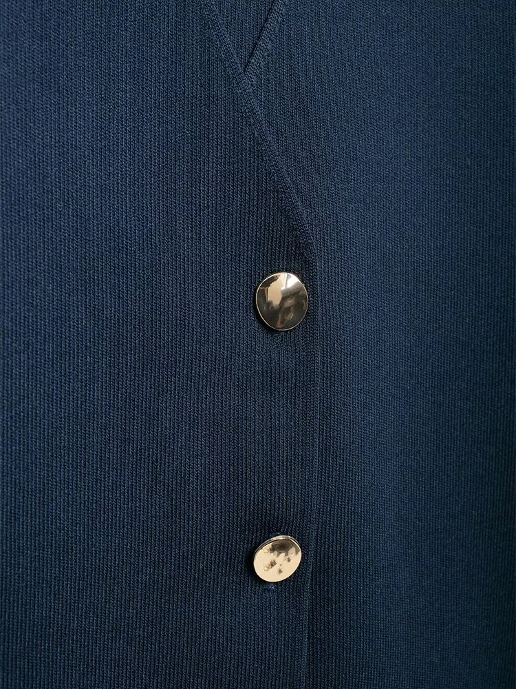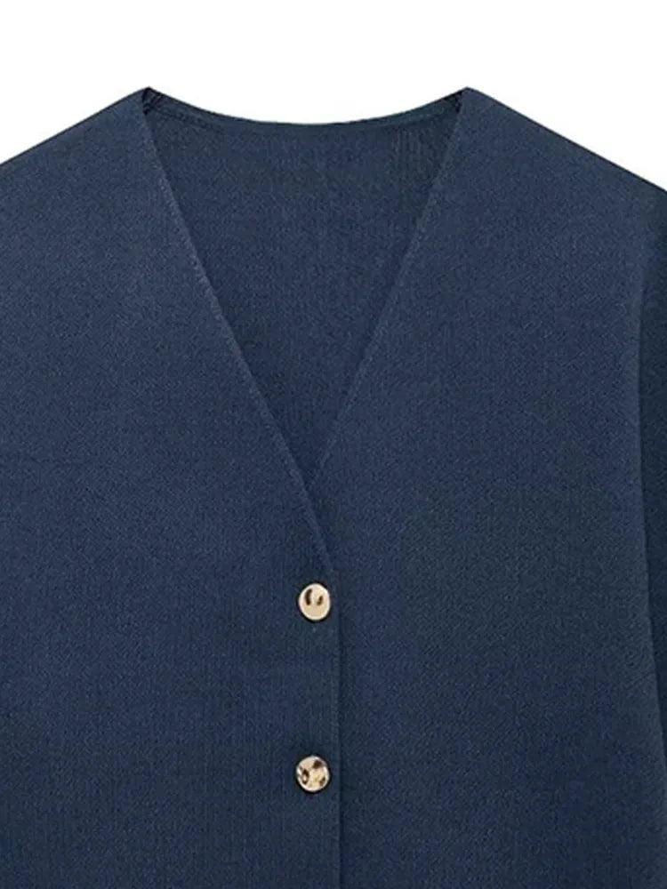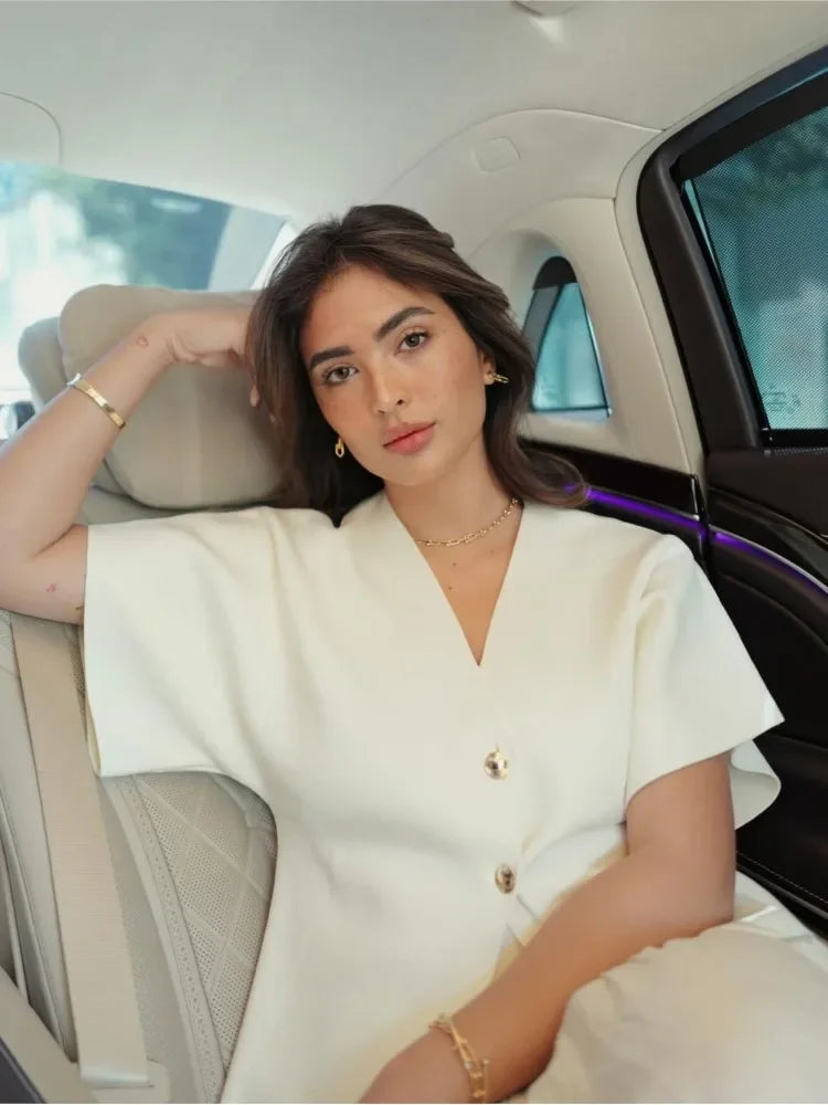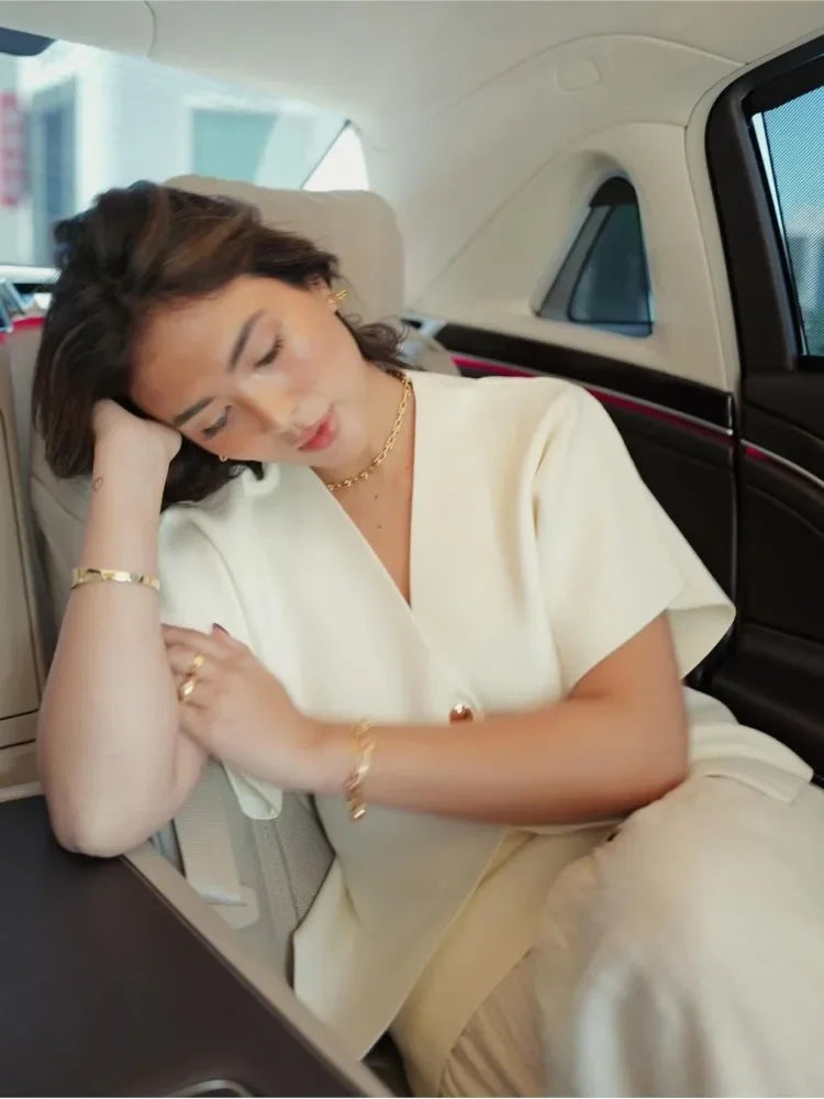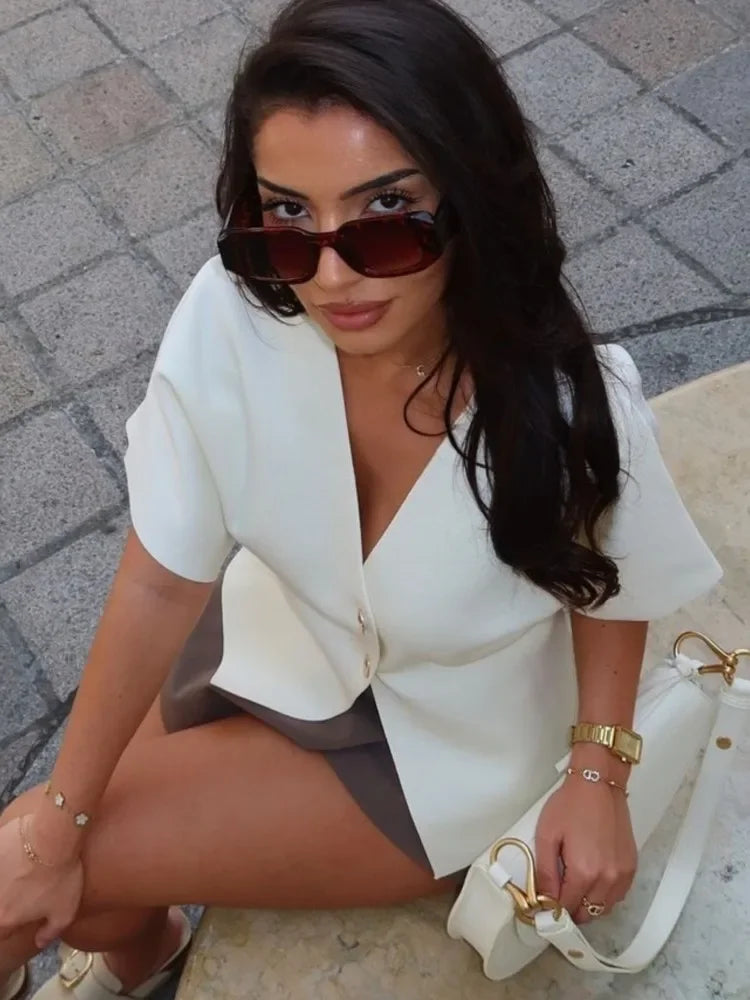 Knitted Flat Pin V-Neck Solid Short Sleeved Tops