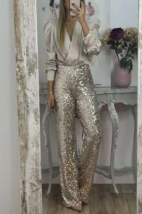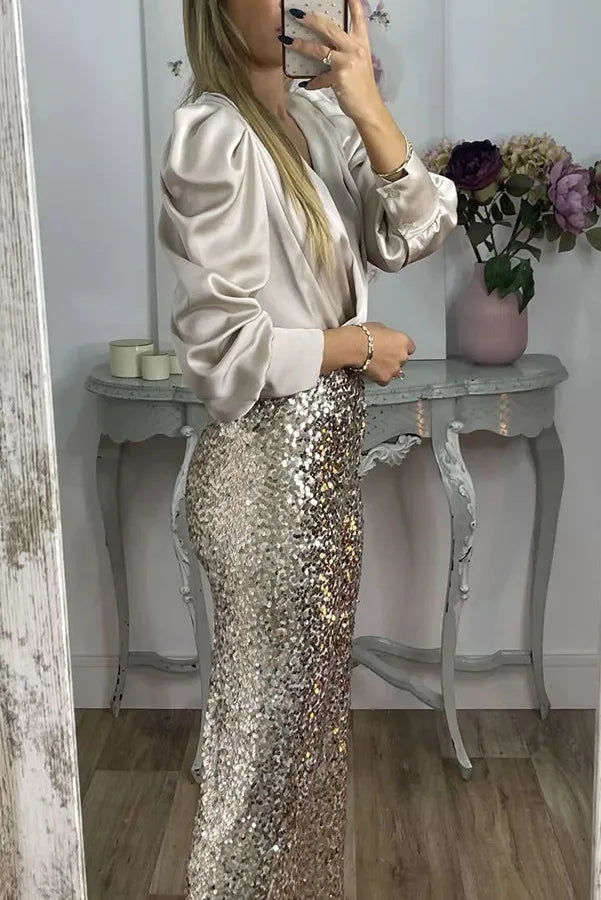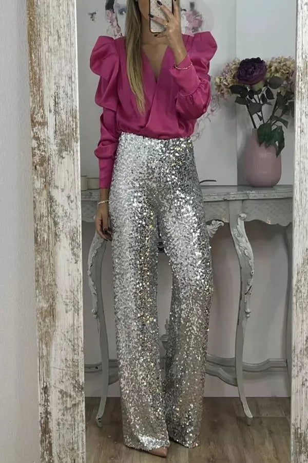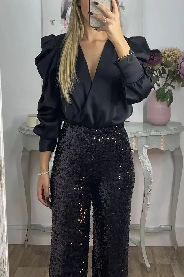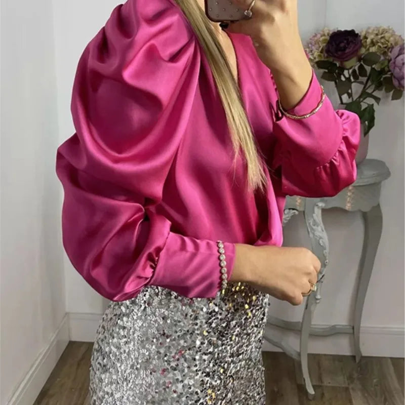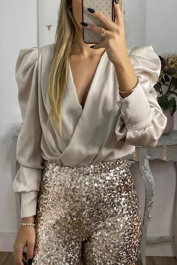 Satin Puff Long Sleeve Pleated Ruffled Tops