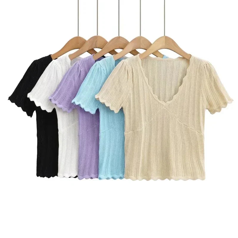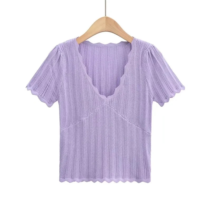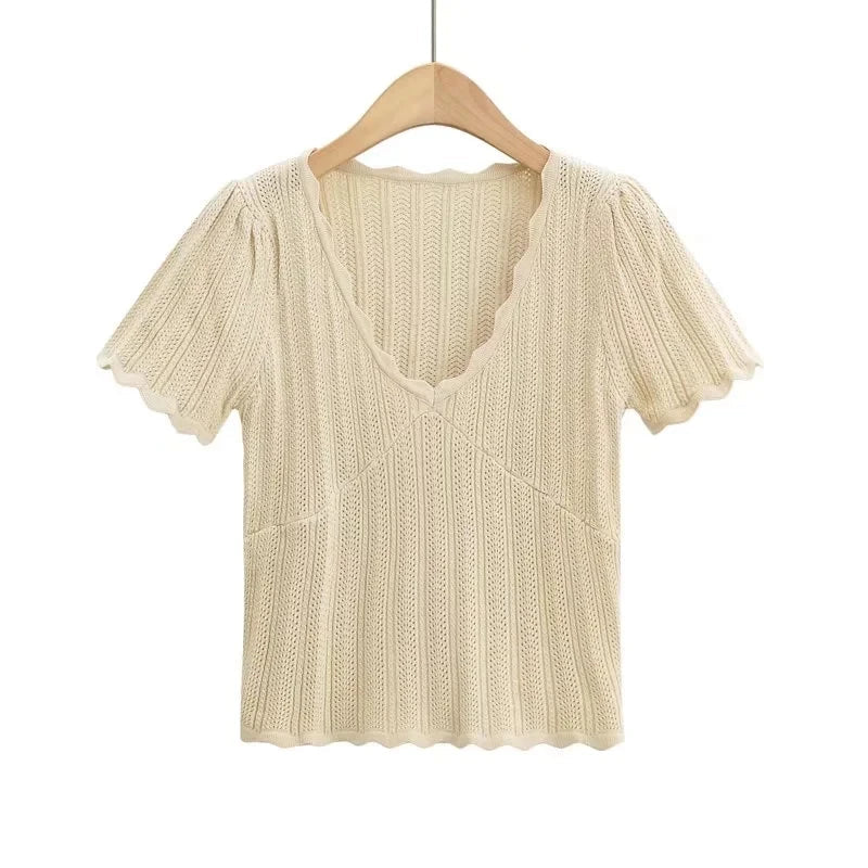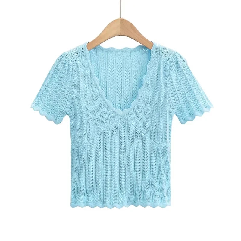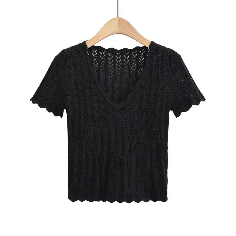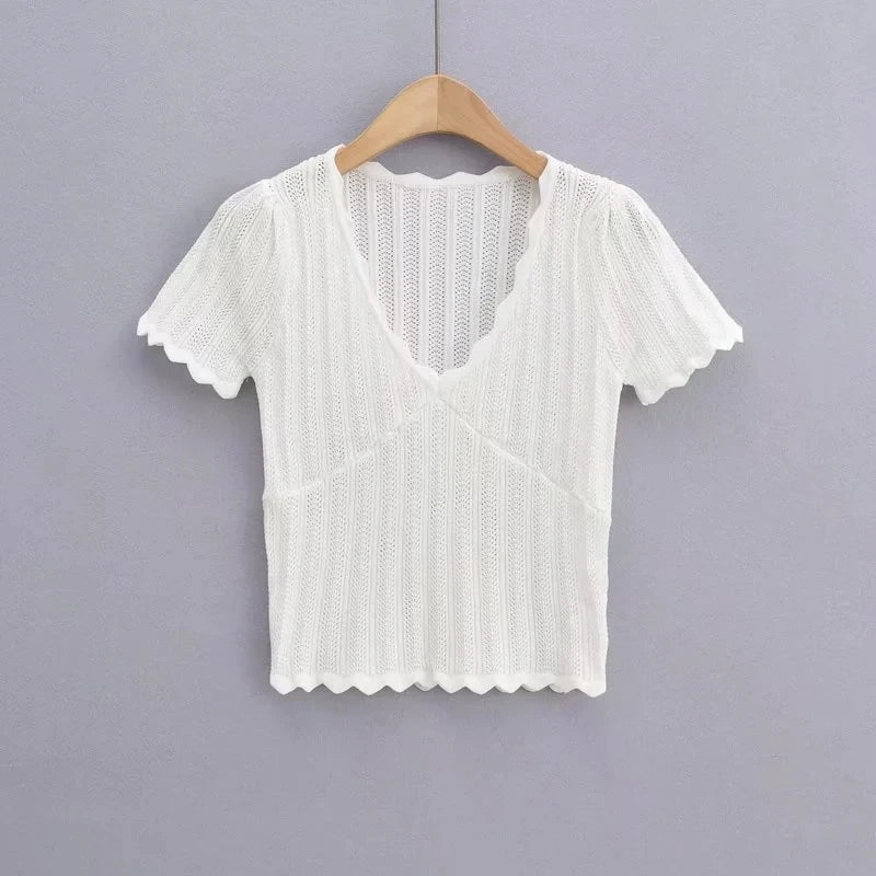 Women V Neck Knitted Crochet Tee