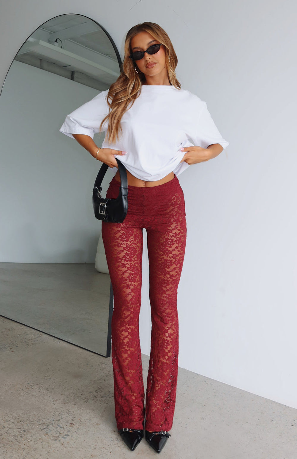 Keep it playful in the New Era Lace Pants Wine. Features sheer, lace fabric, sew-in hot pants, flared leg, thin elasticated waist band and mid-rise fit. Pair with an oversized tee for a chic look we are loving!