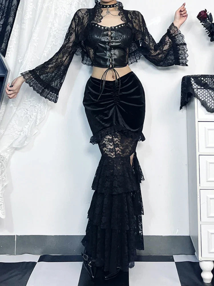 Gothic Folding Fishtail Multi-layer Splicing Split Woman Velvet High Waist Lace Patchwork Mermaid Skirt