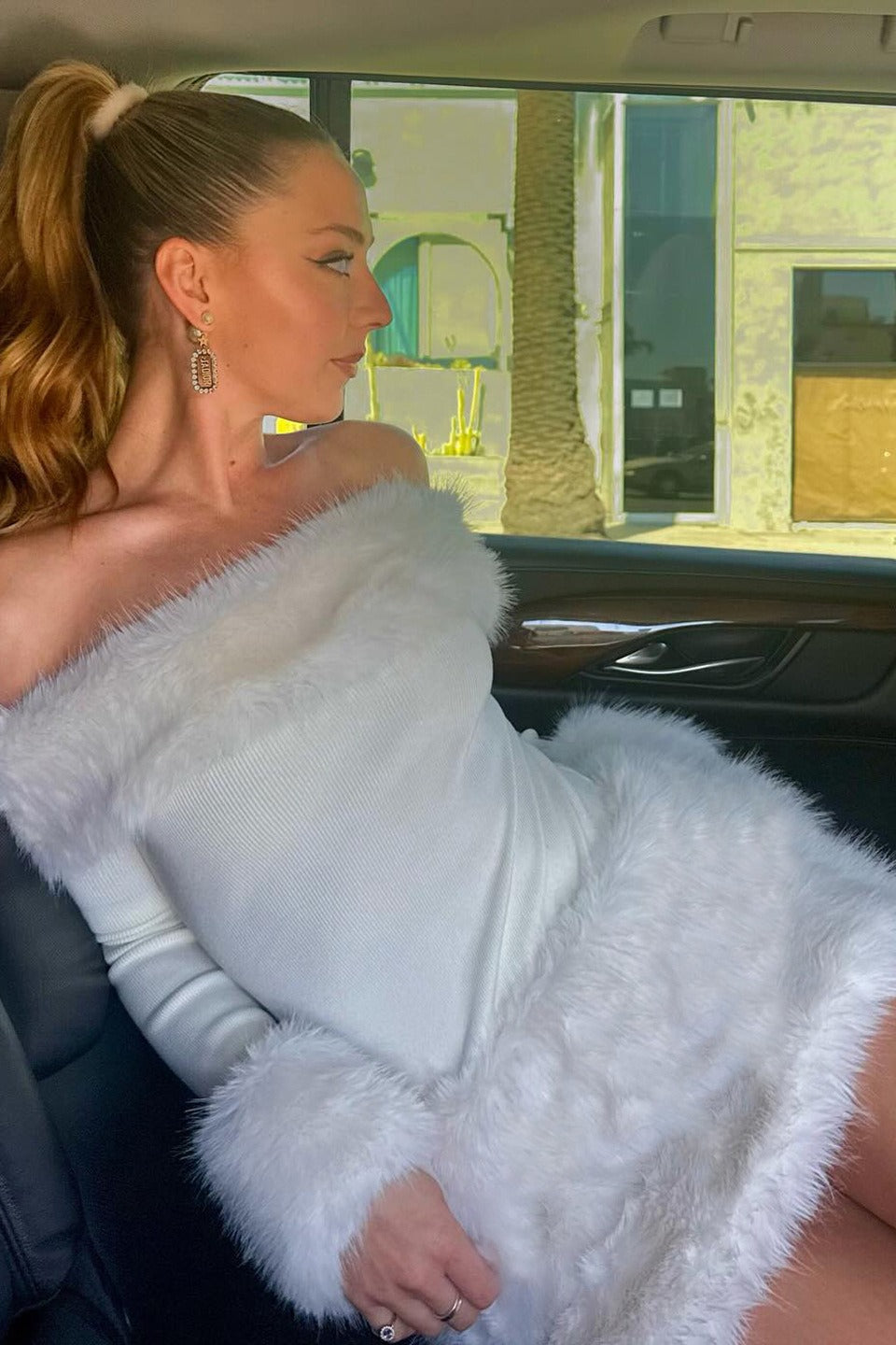Plush Trimmed Off Shoulder Slim Knit Formal Sweater Dress