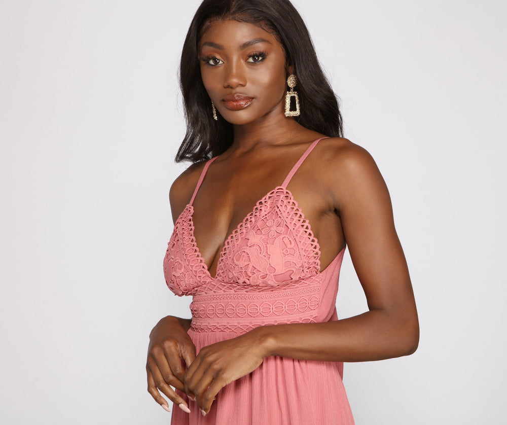 Get a casual cute look in this lightweight linen skater dress. It features adjustable spaghetti straps. a lined crochet bodice with a V neckline. an open back with a tie closure. and a flowy. skater silhouette. The gauze and linen fabric has a knit lining. Complete your outfit with adorable wedges and a chic shoulder bag.