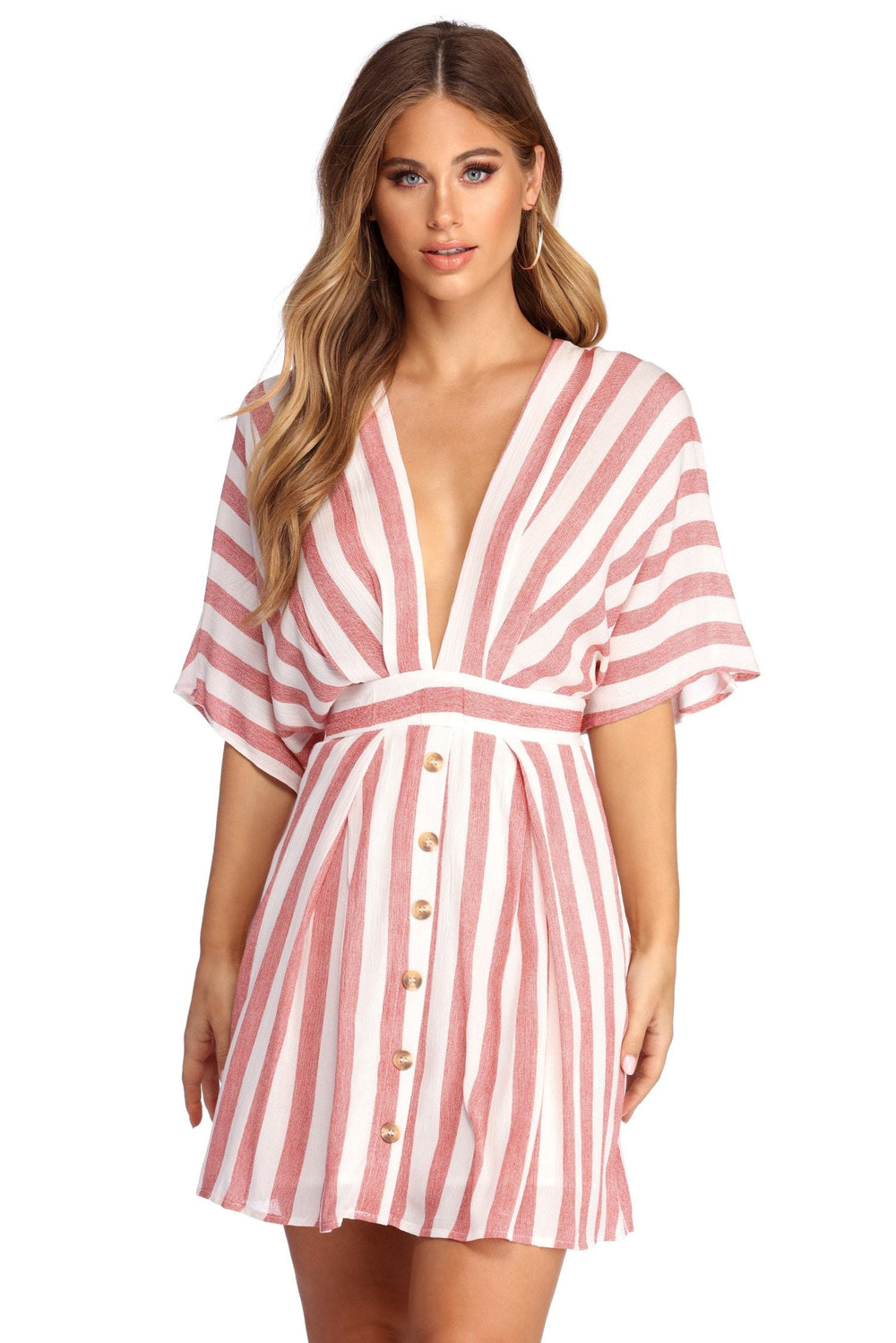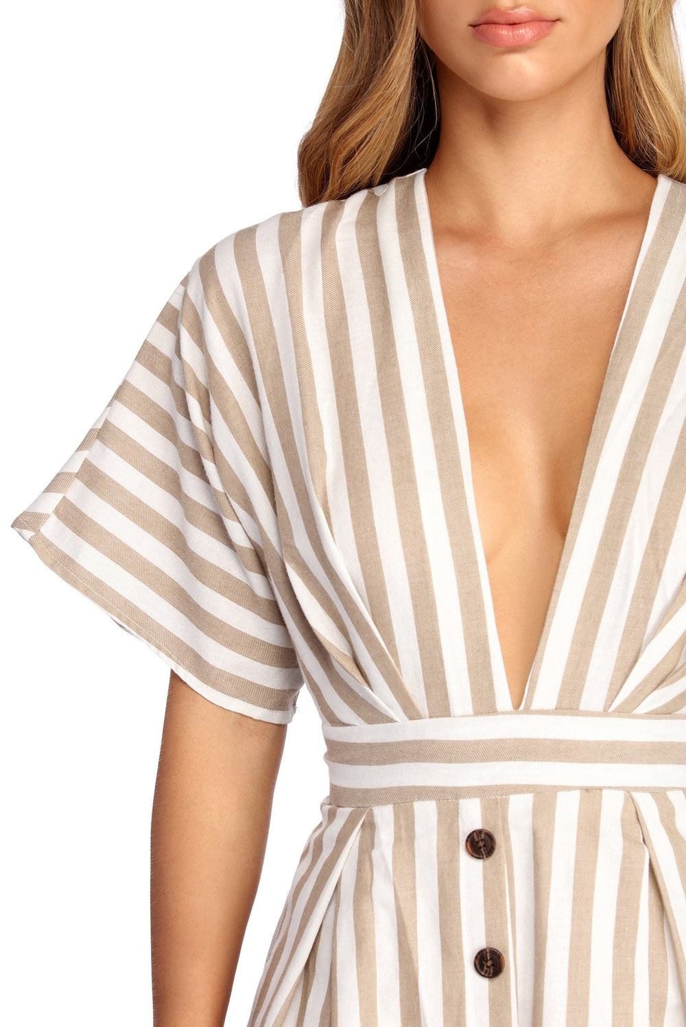Button up in stylish stripes! This pretty dress features a plunging V neckline. kimono sleeves. a cinching tie waist accent and a multi button down front withtortoise shell hued buttons that lead to an A-Linesilhouette. The back features a matching plunging V shape. an adjustable bar strap detail and a hidden zipper closure. The all over stripe pattern features blue and white hues. Dress is composed of a lined gauze fabric that offers a relaxed fit with minimal stretch.