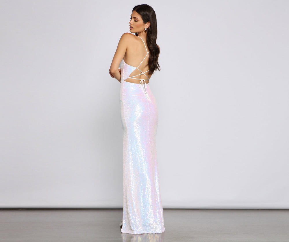 Get a gorgeous iridescent glow in the stunningly chic Brenna dress! She features a sleeveless V-neckline with a notched front detail. padded cups. spaghetti straps that lead to a cross-back lace-up design. and a floor-length mermaid silhouette with a thigh-high side slit. The dress features all-over iridescent sequin embroidery for a pretty vibe. Style this dress with clear heels.