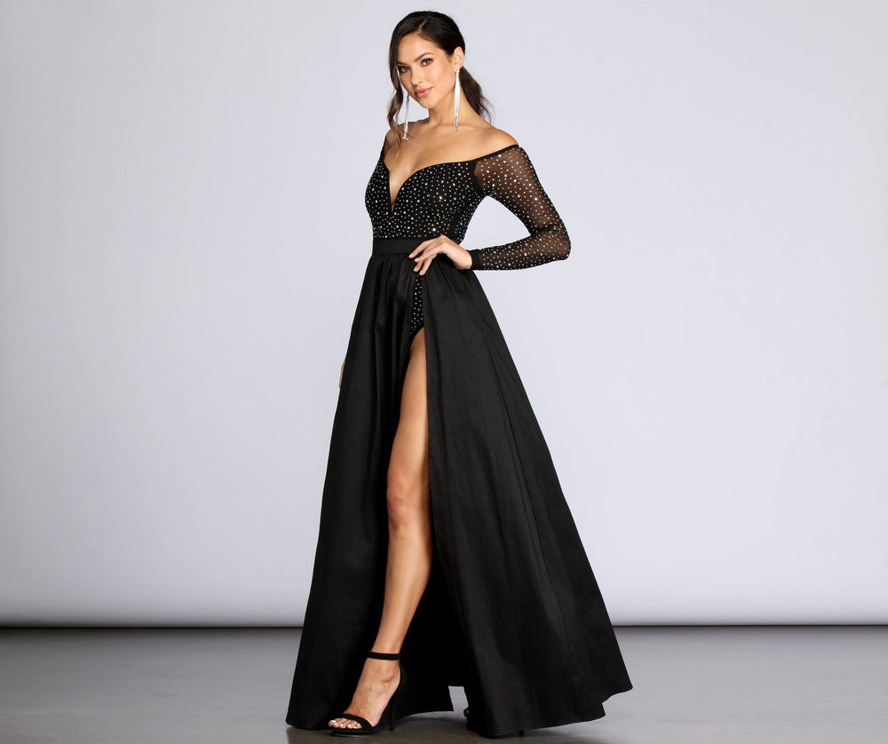 Light up the evening in our enchanting Rory dress! She features a heat stone embellished bodice with an off the shoulder neckline. a plunging wired sweetheart neckline and sheer unlined fitted long sleeves. Her bodice leads to a sweeping floor length A-Line silhouette accented with a high side slit. Rory is composed of a combination partially lined mesh and taffeta fabric. Includes a full bottom bodysuit contrast lining with snap button closure. Dress offers a form hugging fit with a moderate stretch.