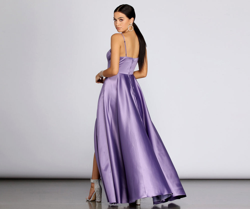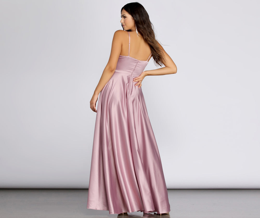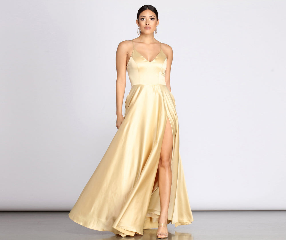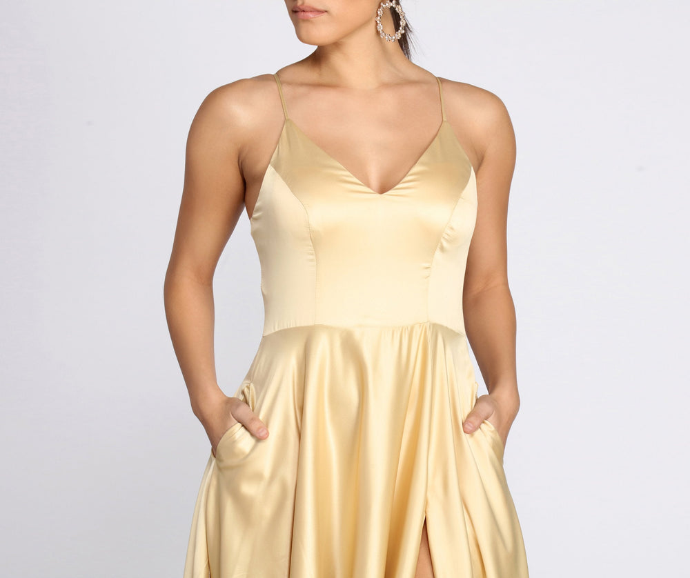 Radiate effortless elegance in our sophisticated satin Juliet gown! She features adjustable spaghetti straps. a V-neck seamed bodice with light padding at bust. a high-seam waist. and a long. gently pleated A-line skirt with pockets at either hip and a dramatic center front slit. Juliet is fully lined and made from a smooth. shiny woven material with a touch of stretch.Pair this beautiful dress with a shimmering rhinestone necklace for a glamorous look.