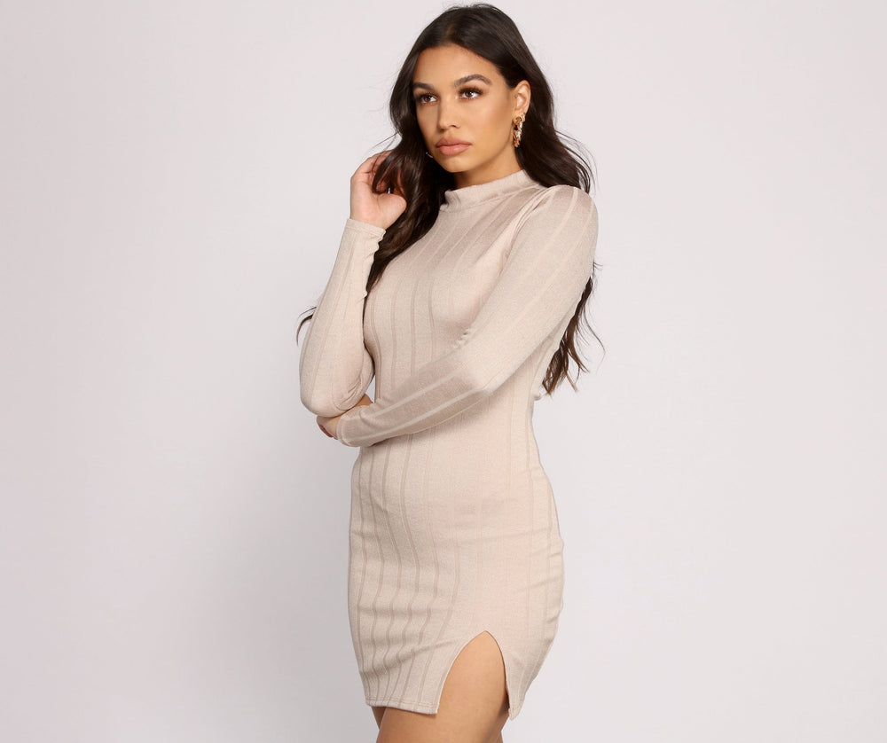 Amp up your basic mini dress with a trendy side slit! This staple piece dress features a mock neck. long sleeves. and a side slit. The dress is composed of a lined ribbed knit fabric that offers a form hugging fit with a moderate stretch. Complete look with ankle booties.