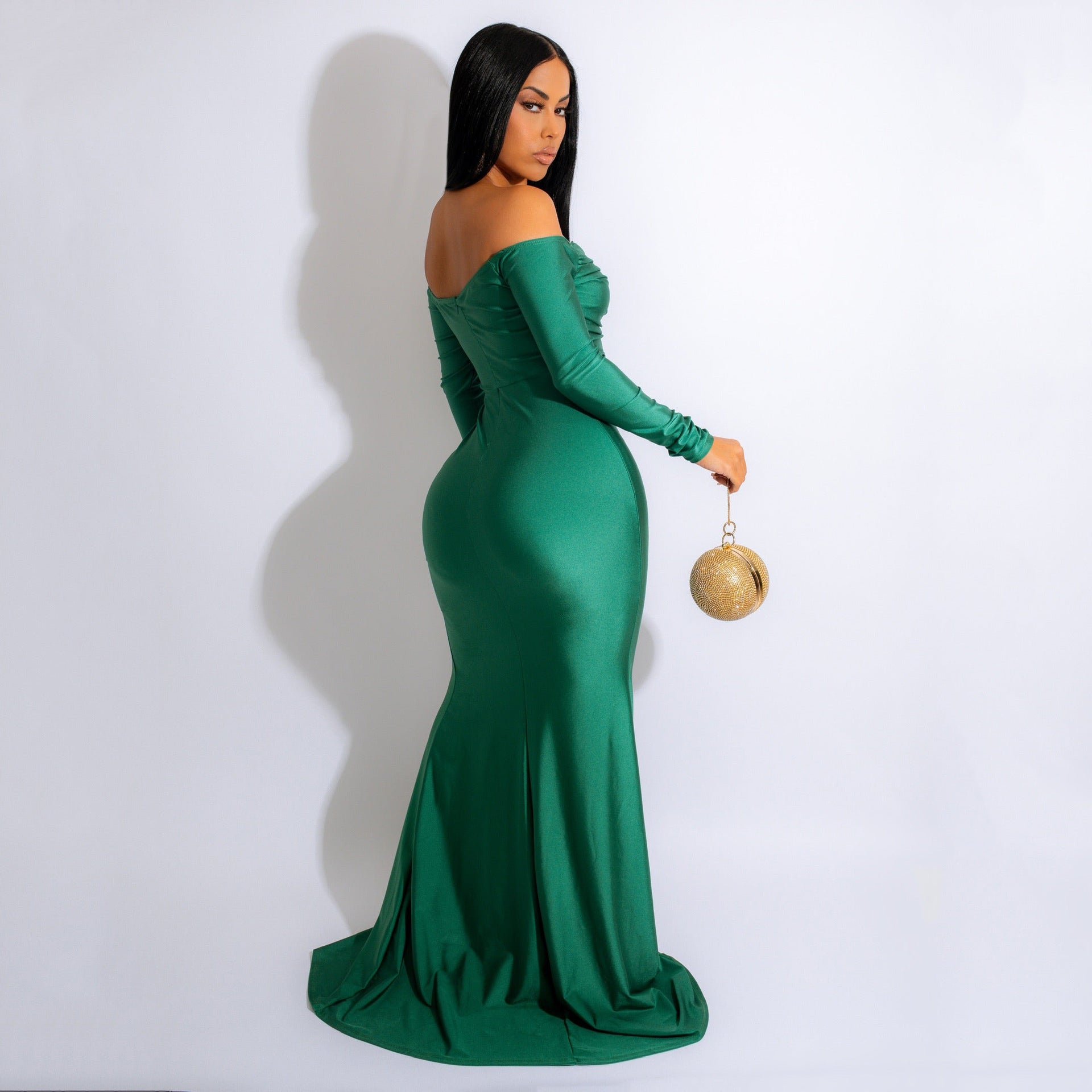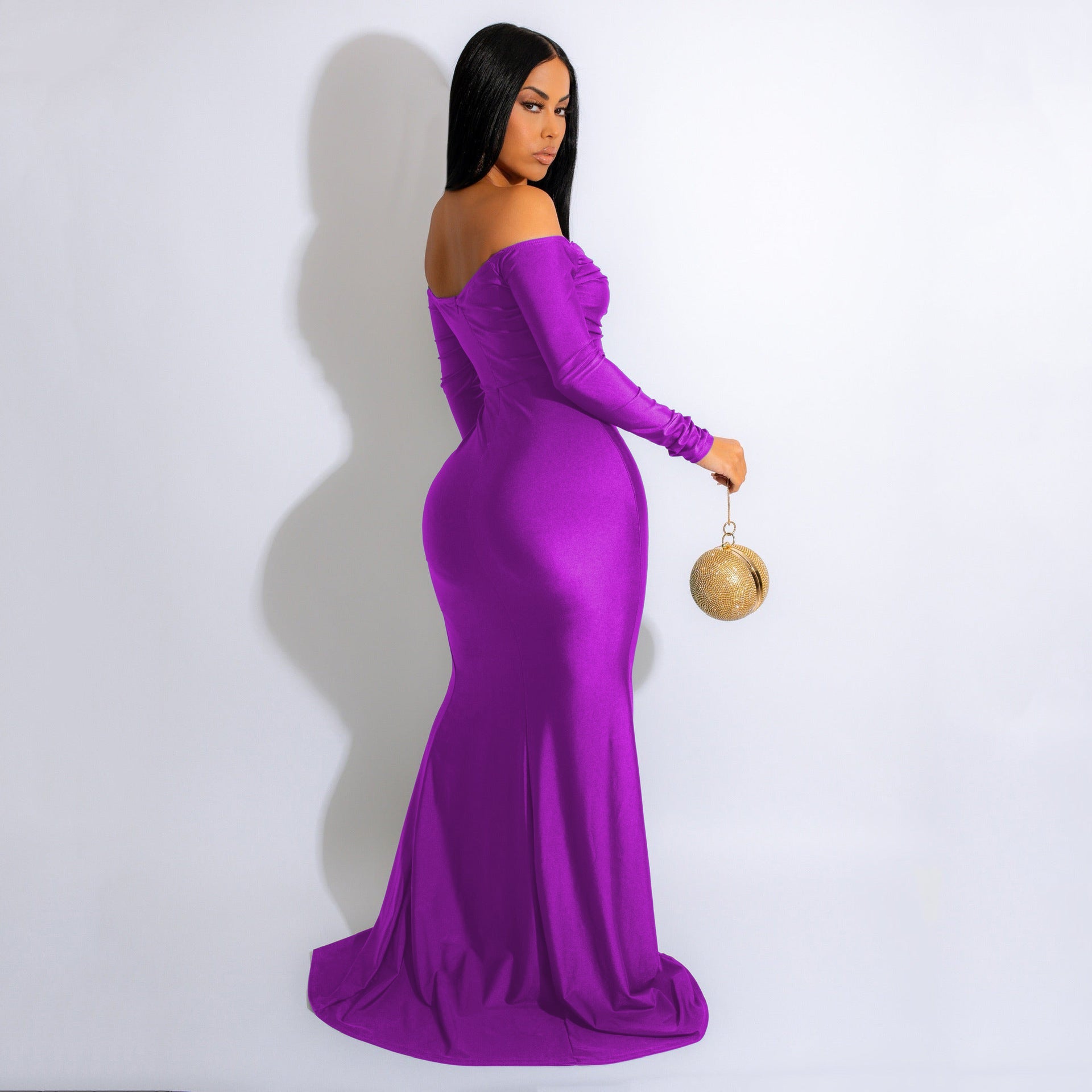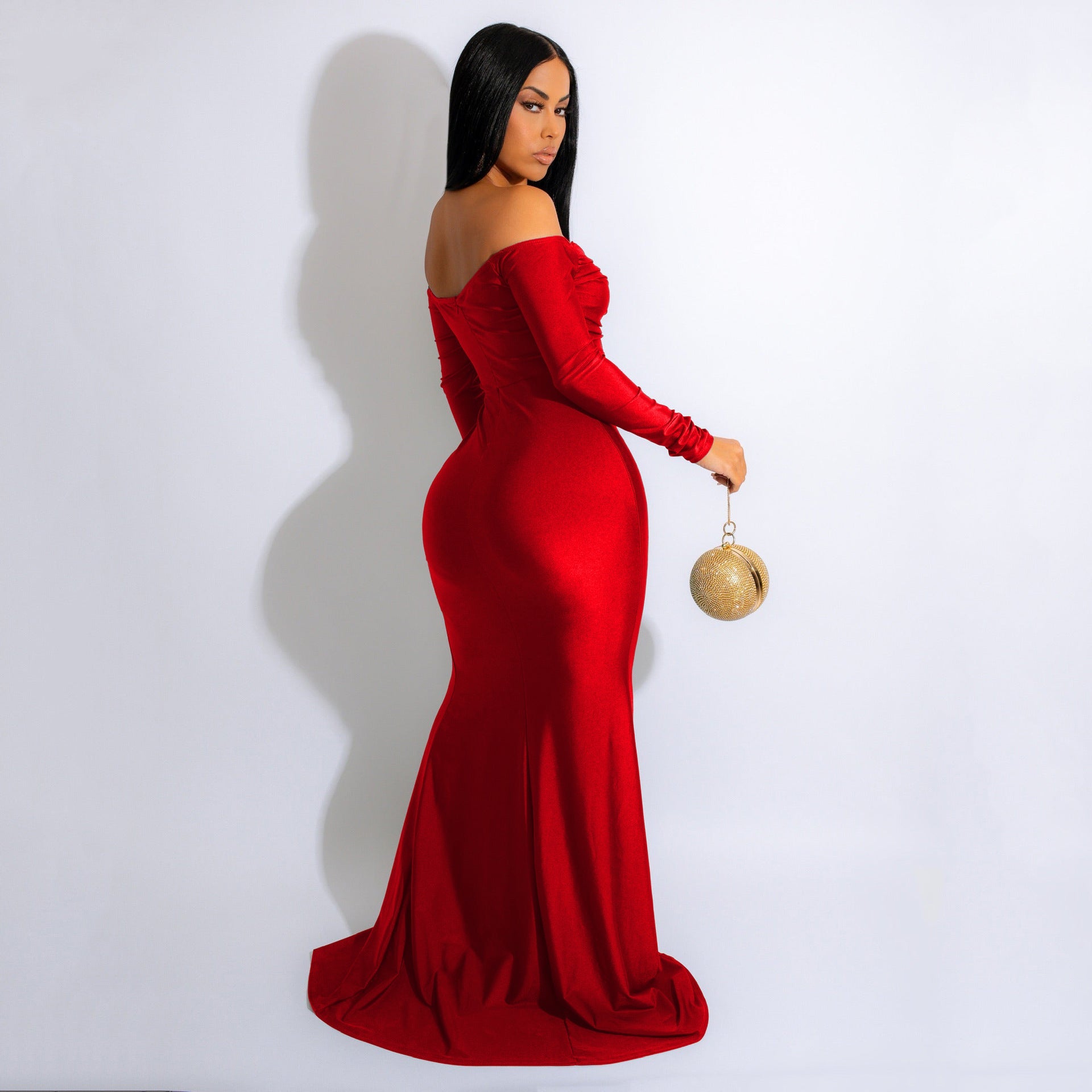 Radiate elegance in our luxe Larsa dress! She features an off-the-shoulder neckline with a sweetheart bust. long lace sleeves. and a mermaid silhouette accented with a high-side slit. The dress is composed of a lined velvet fabric that offers a form hugging fit with a moderate stretch. Complete look with rhinestone earrings and a sleek clutch.