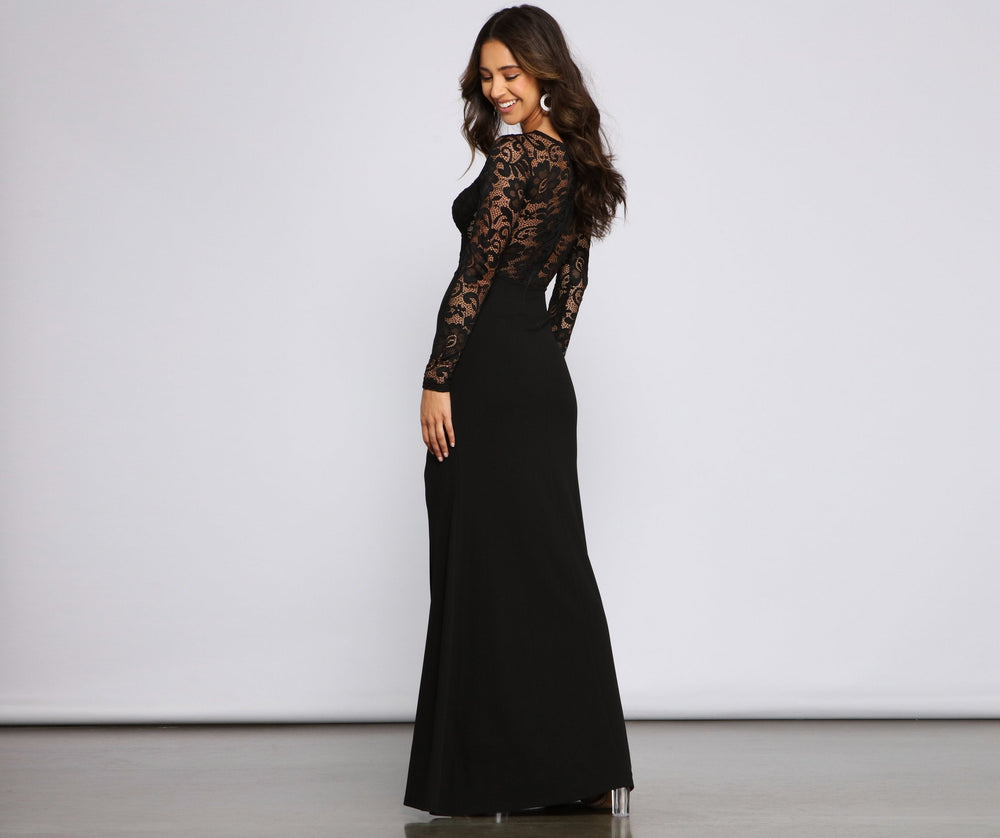 Impress in lace! You'll stun in this formal dress the moment you enter the room! April features a sweetheart neckline with padded cups. a partially unlined bodice with piping accents. long lace sleeves. and a mermaid silhouette with a high side slit. The dress is composed of a combination lace and crepe fabric that offers a form hugging fit with a moderate stretch. Complete look with chrome heels and a rhinestone anklet.