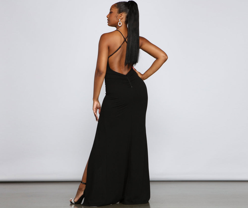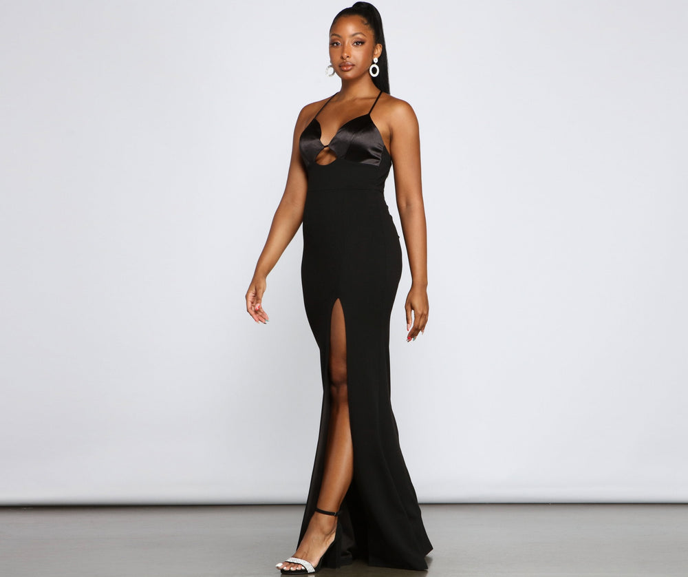 Strike a pose in a formal dress that leads the way! The dress features a sleeveless V-neckline with a notched accent. satin bodice. a cutout at the midriff. spaghetti straps that cross at the back. and a high side slit. The dress is composed of a crepe fabric that offers a form hugging fit with a moderate stretch. Complete look with a rhinestone bracelet.