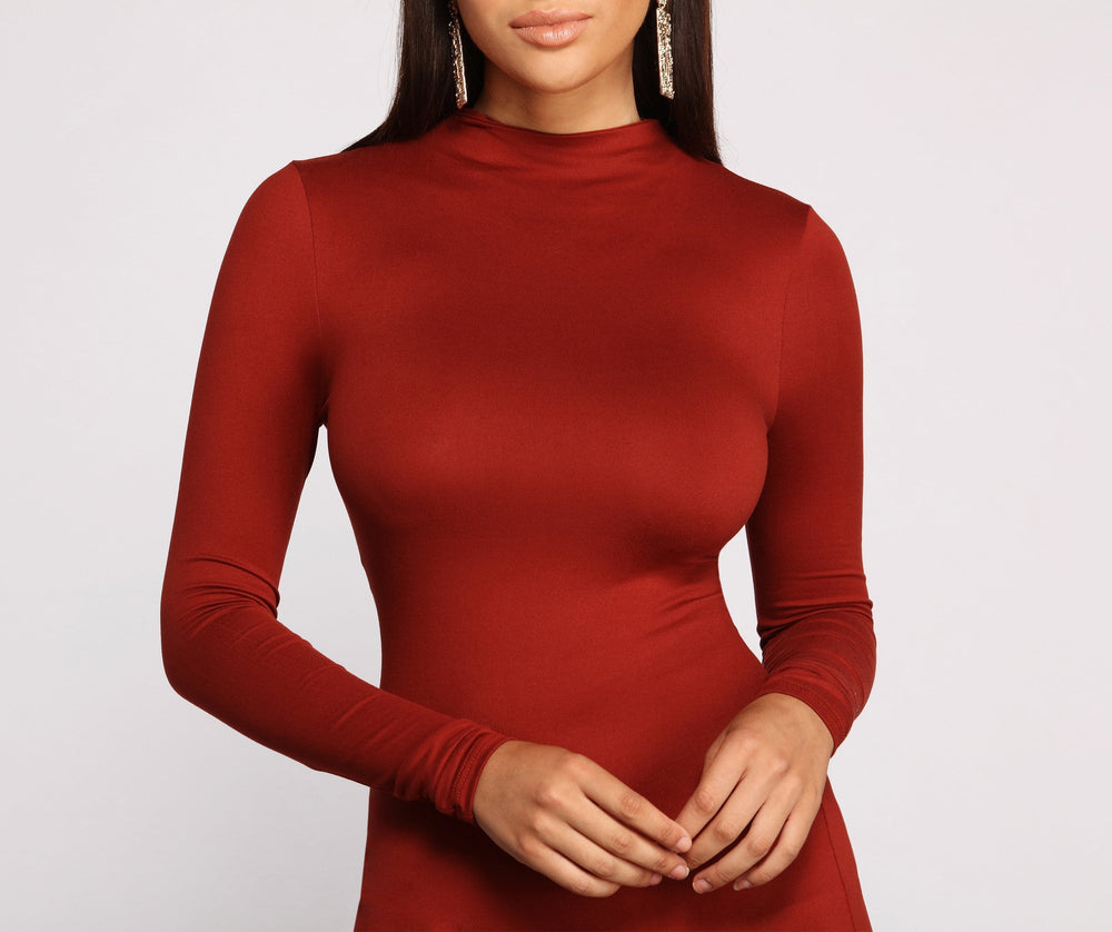 You'll be totally all about this chic mock neck mini dress! Featuring long fitted sleeves and a curve-hugging fit. this dress is perfect for the fall season. Pair with gold hoop earrings and chunky sneakers for that fab everyday 'fit.