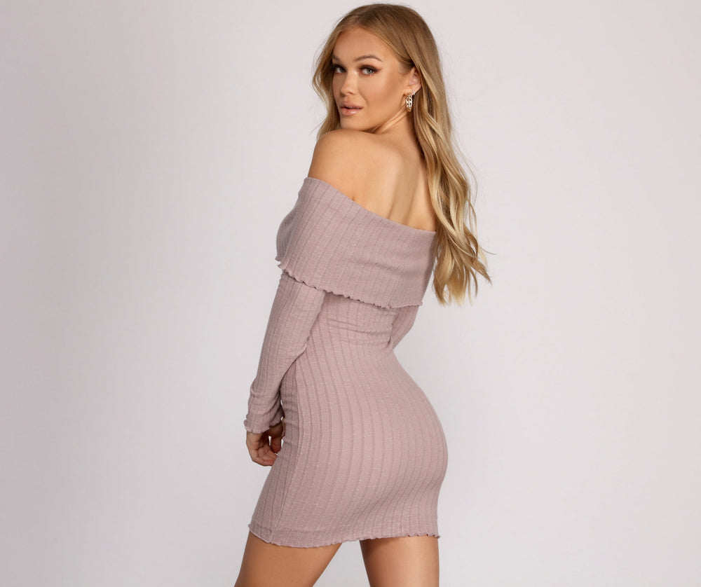 Elevate your everyday style with this adorable brushed knit mini dress! It features an off the shoulder fold-over neckline with long fitted sleeves and a short. curve-hugging silhouette. Pair this dress with heeled booties for the perf winter date night with bae.