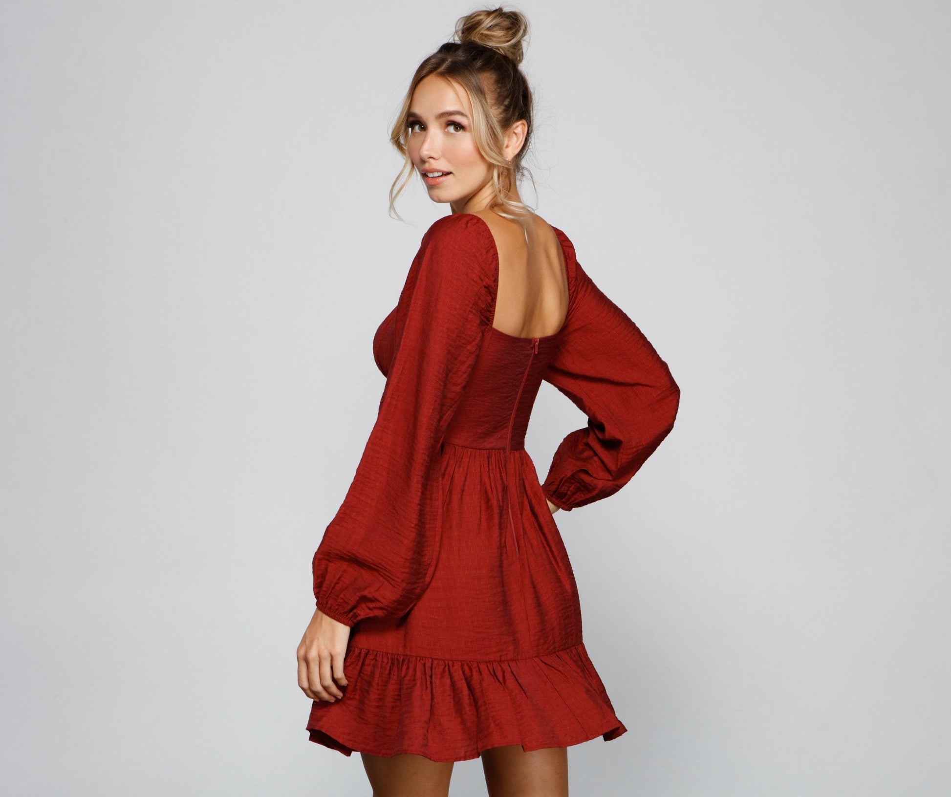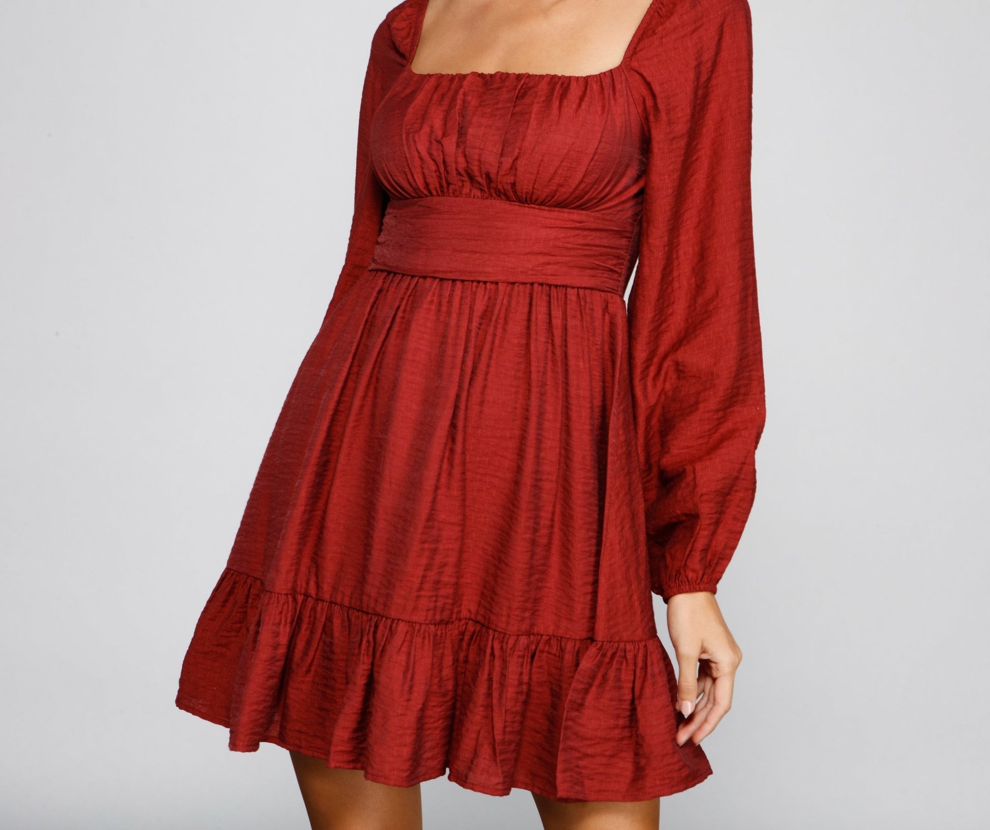 You'll look effortlessly stylish this season in this lightweight and flowy linen dress! It features a square neckline. long balloon sleeves. a front waistband. and a short. A-line silhouette with a ruffle hem. Complete the outfit with a trendy Panama hat and booties.