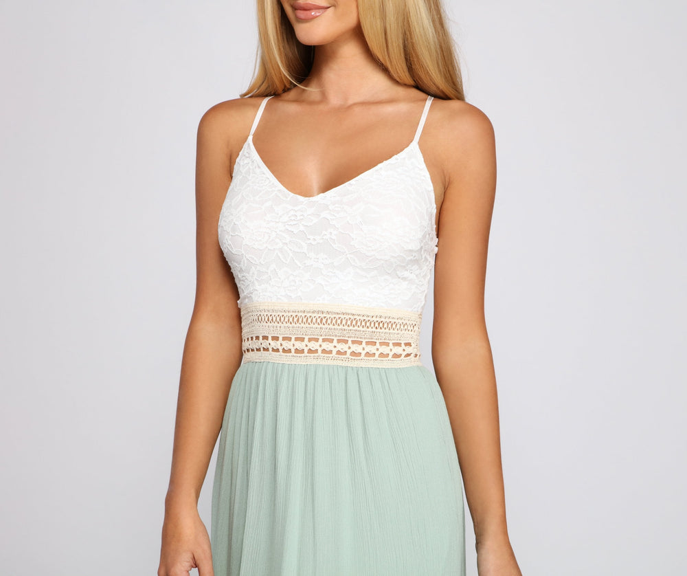 You'll look effortlessly stunning in this flowy maxi dress that is perfect for the warmer months. It features spaghetti straps that lead to a cross-back design. a lace top with a V neckline. a sheer crochet high waist. and a flowy floor-length gauze skirt with a side slit. Complete the look with on-trend wedges.