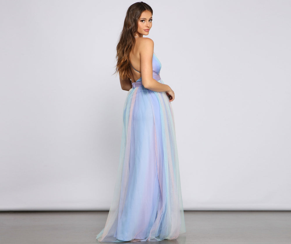Make them dazzle with the lovely Nylah dress! She is a floor-length evening gown with a plunging V neckline and thin adjustablestraps that create an X back. Her wide empire waist leads to a floor-length skirt that dances around your ankles. She is composed of pleated tulle fabric with a sheer appearance and a thin knit lining that features two front slits. Nylah offers a moderate stretch and includes a hidden zipper. Complete look with a rhinestone clutch and adainty rhinestone bracelet.