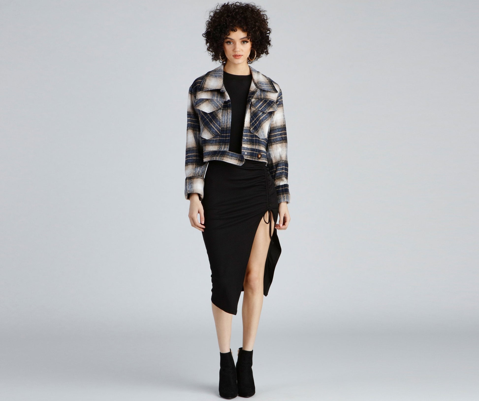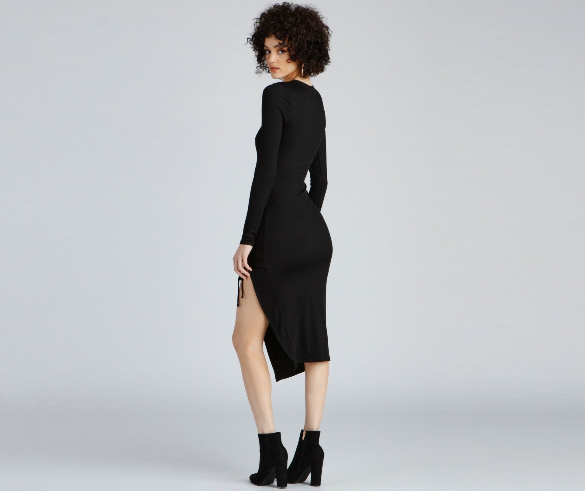 Keep it trendy with a midi dress that can be dressed up for your night date night with bae. The dress features a crew neckline. long sleeves. a ruched drawstring. a high side slit. and a midi-length silhouette. The dress is composed of a ribbed knit fabric that offers a form hugging fit with a moderate stretch. Complete look with ankle booties and a plaid scarf.