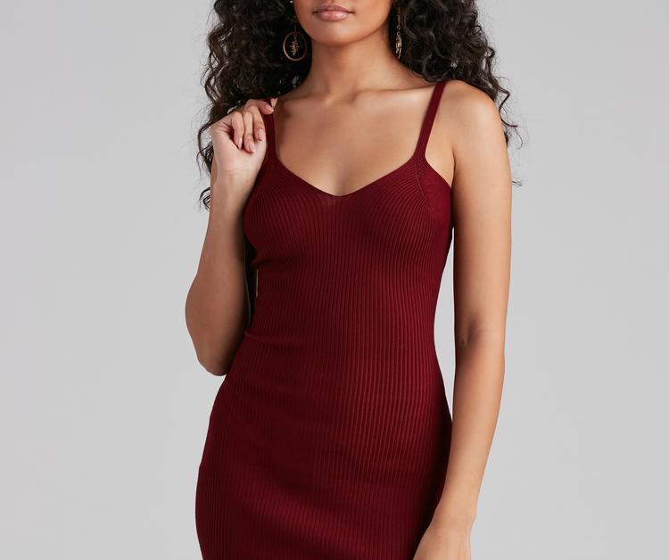 The temps may be dropping but you'll raise them in this sweater dress! It features a sleeveless. spaghetti strap design. v-neck. and a fitted. mini-length hem. Complete the look with the matching top.