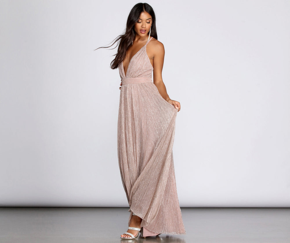 Glow from within as your radiate your natural beauty in our shimmering Haley dress! She features a sleeveless bodice. a plunging V neckline and narrow adjustable straps that lead to a cross back design. Her slim fit bodice leads to a narrow waist band accent and flows into a sweeping floor length skirt with pleated detailing throughout. She is composed of a metallic mesh fabric that offers a relaxed fit with minimal stretch. Dress is lined with a smooth knit fabric and includes a back zipper closure.