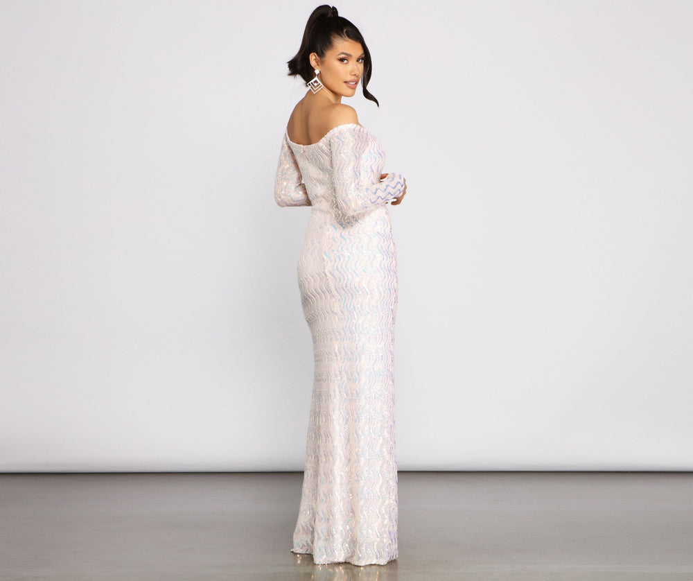 Illuminate the evening with a sparkling formal dress that brings the dazzle to your special evening. The dress features an off-the-shoulder neckline. sheer long sleeves. geometric iridescent sequins throughout. and an A-line silhouette with a high side slit. The dress is composed of a lined mesh fabric that offers a form-hugging fit. Complete look with rhinestone heels.