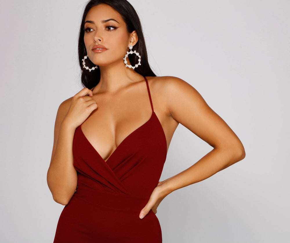 Stun with a formal dress that brings the elegance to your special evening! Giselle features a sleeveless V-neckline with ruching at the bodice. adjustable spaghetti straps that cross at the back. and an A-line silhouette with a high side slit. The dress is composed of a crepe fabric that offers a form hugging fit with a moderate stretch. Complete look with a choker and earrings.