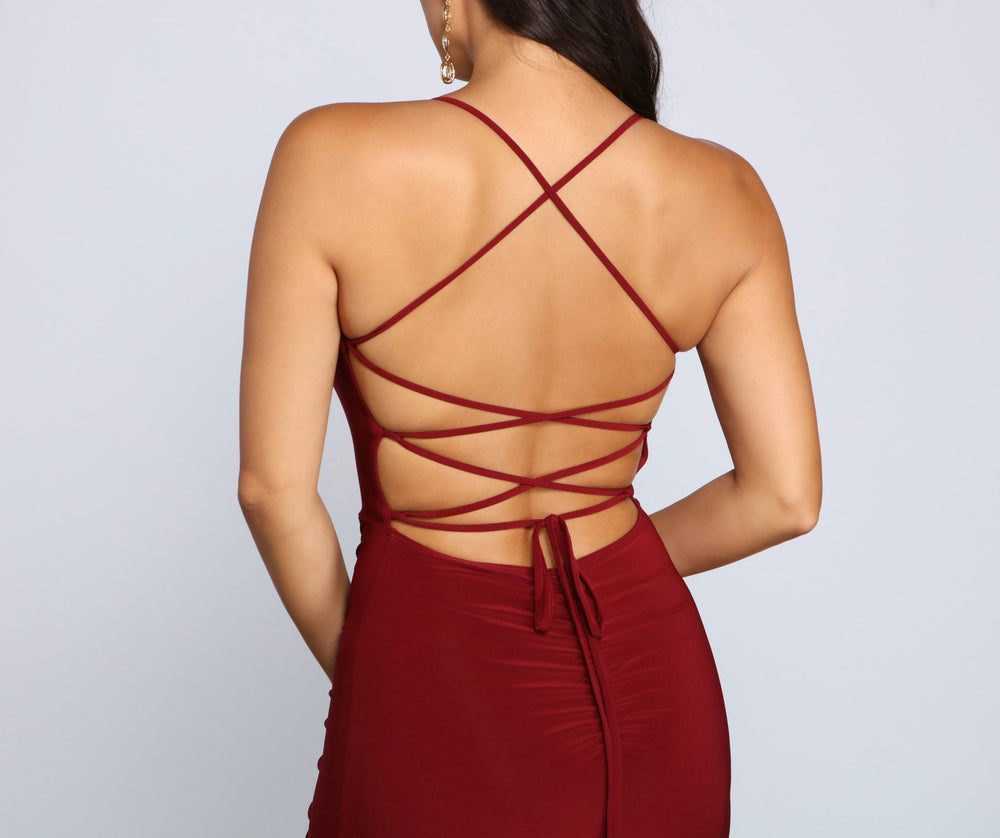 Keep your formal look sultry and stunning in the chic Gia dress! She features a sleeveless square neckline. spaghetti straps that lead to an open back with a lace-up design. ruched detailing. and a floor-length fitted silhouette with a sexy thigh-high front slit. Style this dress with radiant rhinestone earrings and strappy heels.