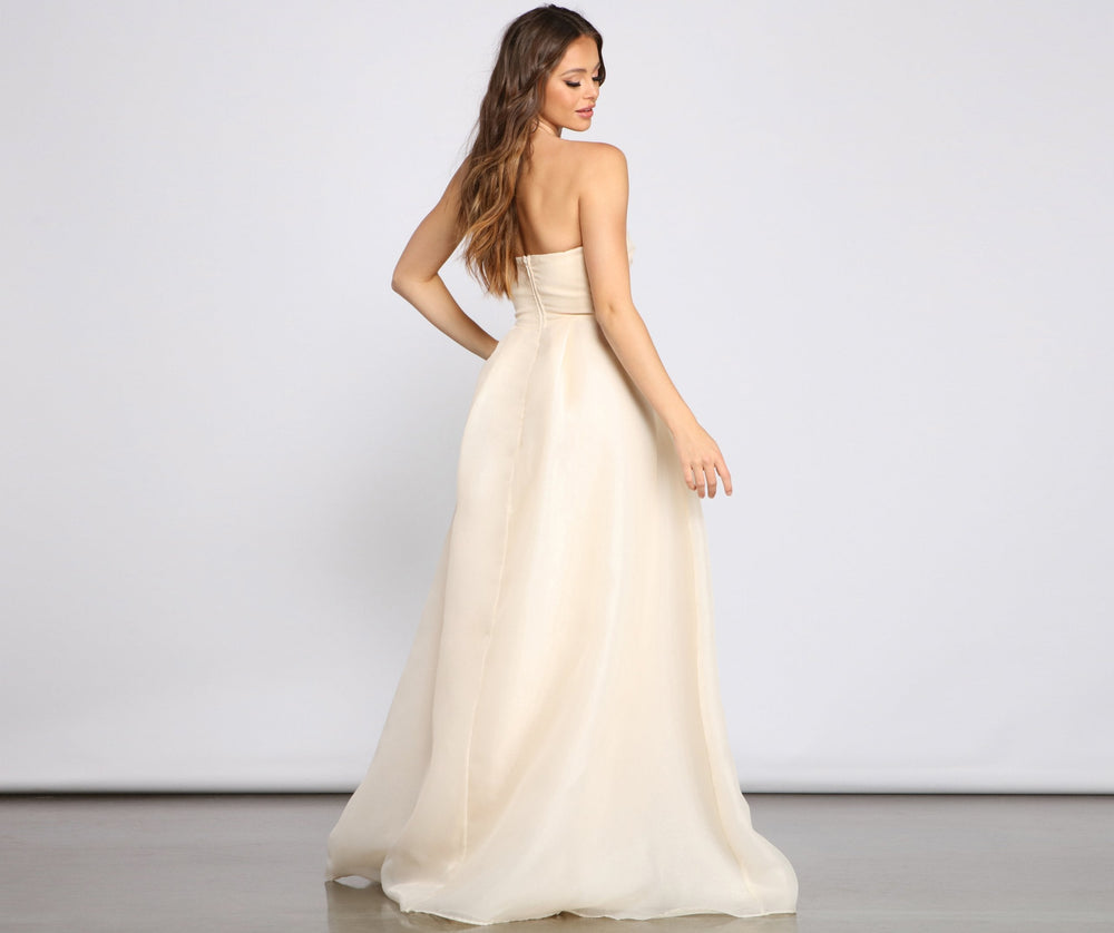 Mesmerize them all with a formal dress that wows! Zora features a sleeveless square neckline. a ruffled accent at the bodice. a voluminous A-line silhouette with a high side slit. The dress is composed of a woven satin fabric that offers a form hugging fit with minimal stretch. Complete look with rhinestone heels.