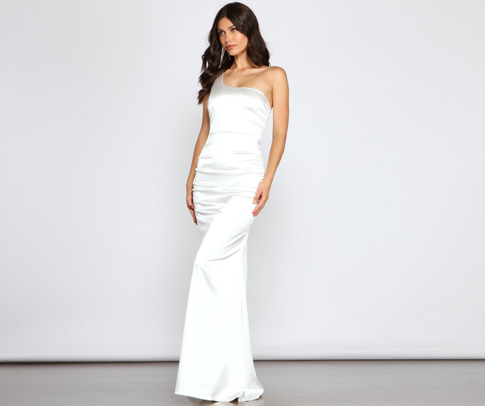 Make a timeless entrance with a formal dress that enchants! Verona features a one-shoulder neckline. a supportive tank shoulder strap. a ruched body. and a mermaid silhouette. The dress is composed of a lined satin fabric that offers a form hugging fit with a slight stretch. Complete look with rhinestone heels and a rhinestone headband.