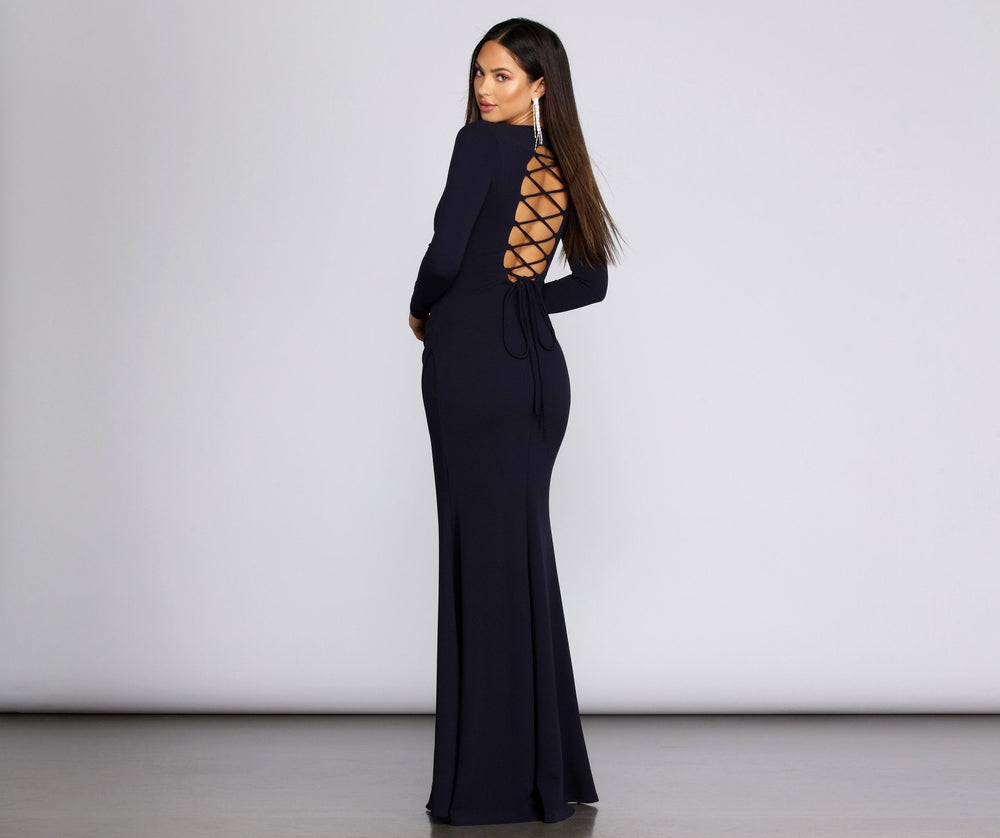 Introducing our Tulip Gown! She is designed with long sleeves. a deep v neckline. and an overlapping bodice. Skirt has a wrap design that cinches at one side of the waist. and her hemline flows to a floor length. She is composed of a crepe material that offers moderate stretch. Her back detail is the star of the show with a lace up strappy detailing.