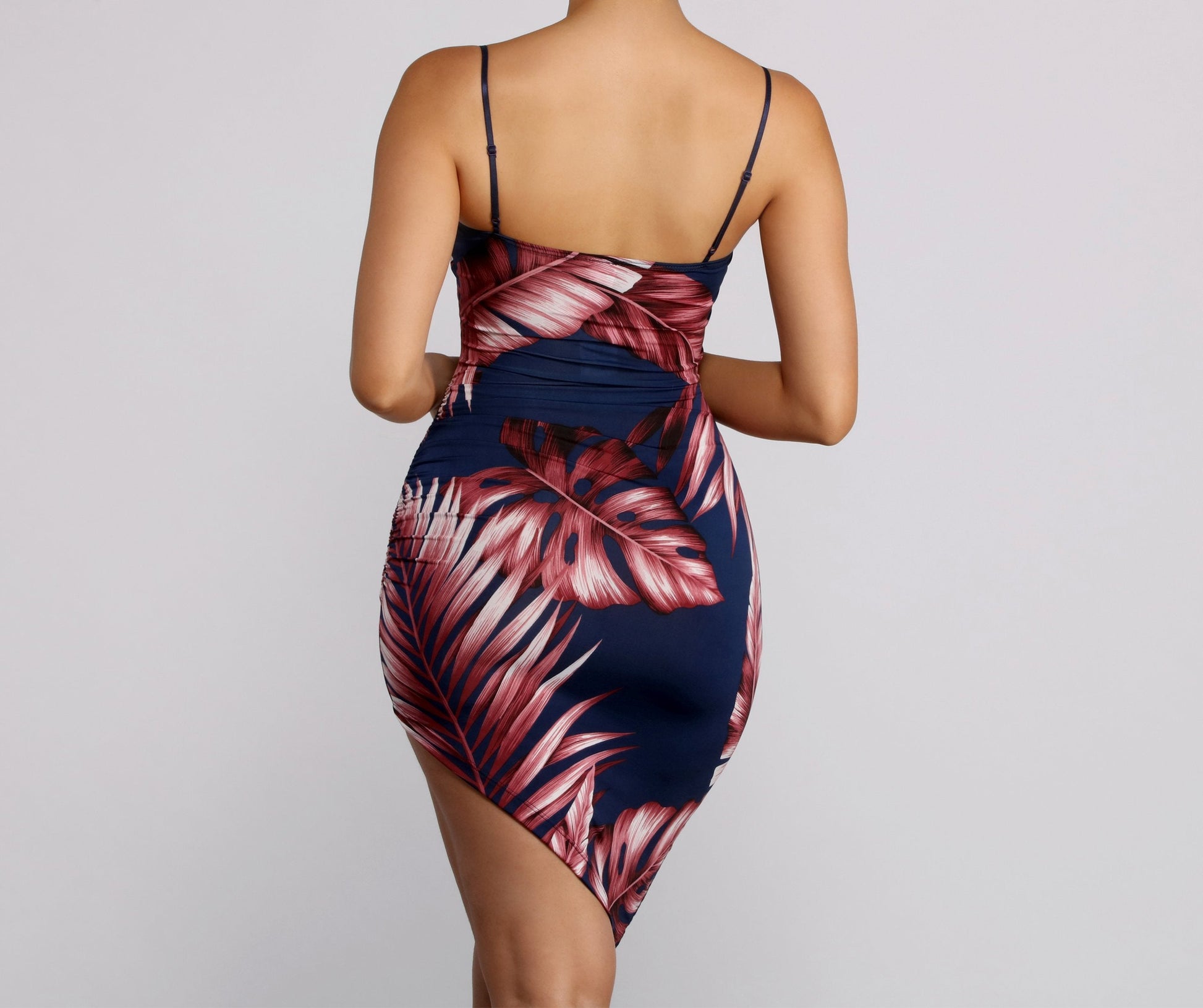 You'll be ready for date night on the beach in this tropical print mini dress. Style it with clear heels and hoops for an effortless look.