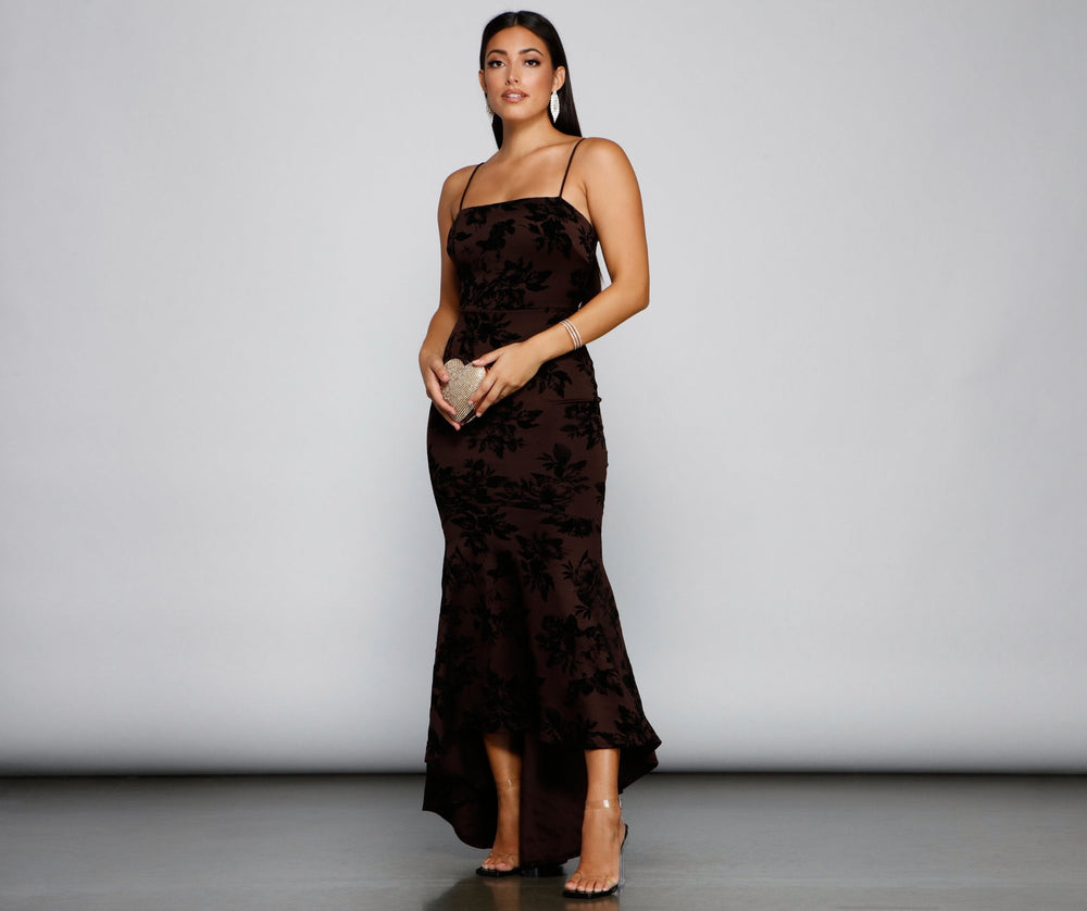 Radiate timeless elegance with a formal dress that captivates. Phoebe features a sleeveless square neckline. spaghetti straps. velvet floral flocked pattern. and a sweeping mermaid silhouette with train. The dress is composed of a crepe fabric that offers a form hugging fit with a moderate stretch. Complete look with stiletto heels and a sleek clutch.