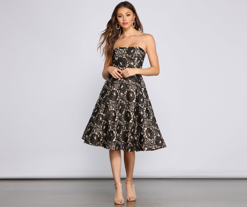 Stun in the elegant and twirl-worthy Corrine formal dress. She features a strapless subtle sweetheart neckline. a hidden back zipper closure. a fitted high waist. and a flared-out tea-length skirt with a flowy silhouette. The sheer lace fabric has a chic brocade pattern and a nude woven lining. Style this dress with rhinestone stud earrings and heels.