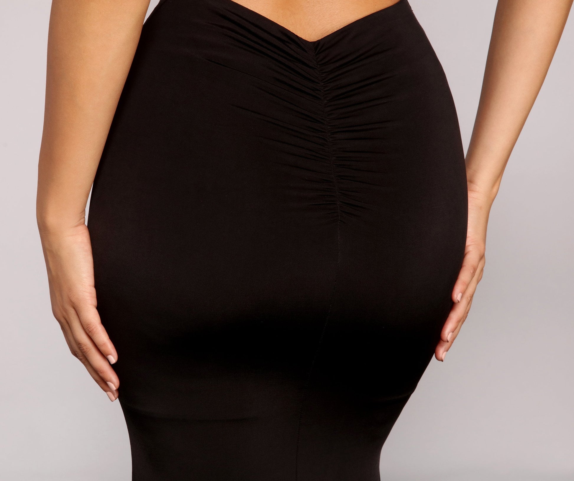 Step out and slay in the sultry and chic Kelsey dress! She features a sleeveless bodice. a plunging V-neckline. halter straps that lead to a lace-up back design. and a floor-length. curve-hugging mermaid silhouette. Style this dress with rhinestone statement earrings and a sparkly clutch.