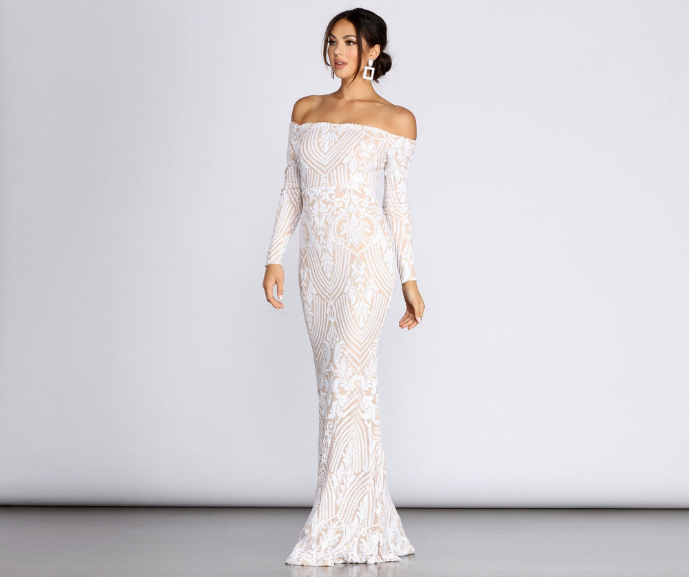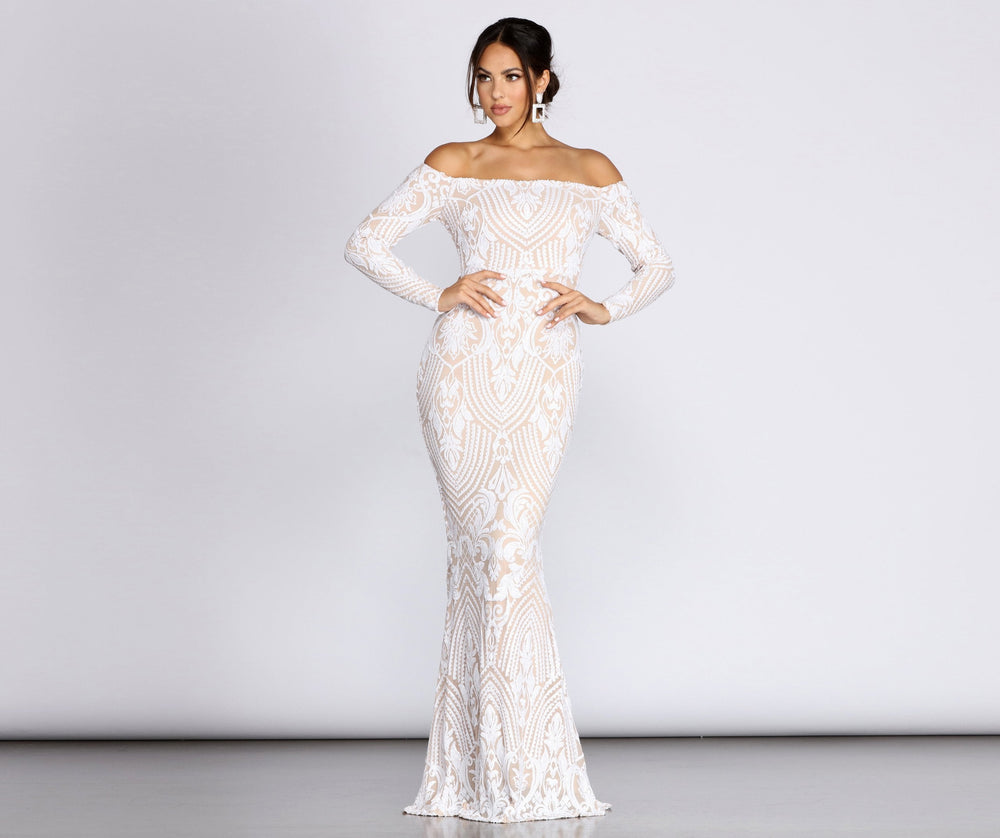 Be a total sequin stunner in our Sierra formal dress! She features an off the shoulder square neckline. long fitted sleeves. a back zipper and hook and eye closure. and a high waist seam. Her long floor-length skirt flows down beautifully and has a flattering. form-fitting look. The dress is composed of a sheer mesh fabric adorned with all-over sequins in an intricate pattern and includes a stretchy knit lining. Style this dress with rhinestone statement earrings and a sparkly evening bag.