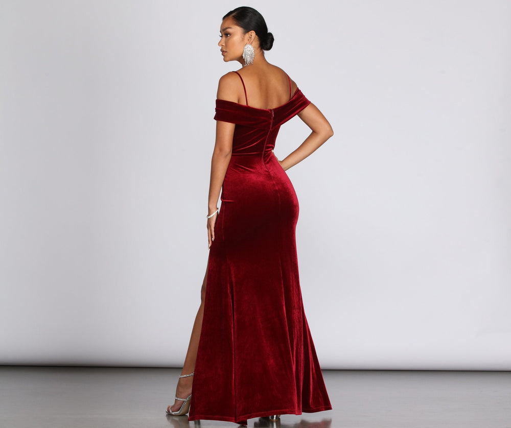 Gain elegance in our Christiana. She has a sweetheart neckline. off shoulder sleeves. and spaghetti straps. Her neckline has a fold over detail and her bodice has a wrap design which makes for a flattering fit. Skirt meets high waist and features a high thigh slit at one side. She is fully lined with a soft knit material and she has a hidden zipper closure at the center back. Her hem is floor length. and she is composed of a velvet like material that offers moderate stretch.