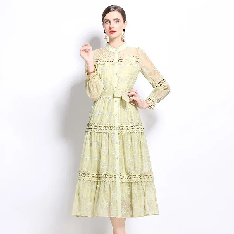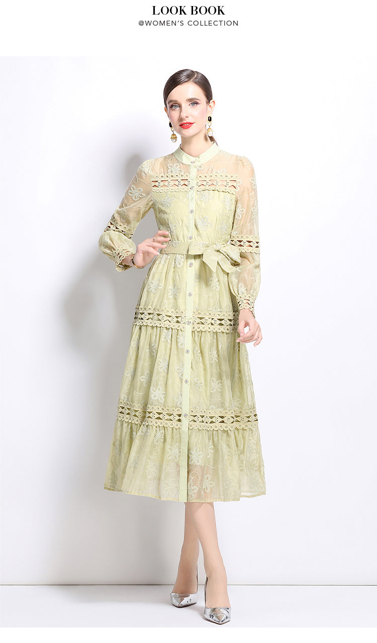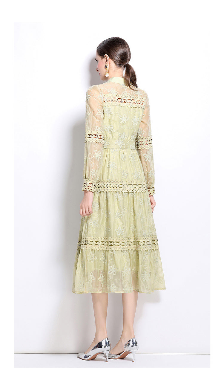 Elevate your fashion game with Jessica’s Floral Fantasy Dress, designed with intricate hollow-out patterns and a chic belt to accentuate your waist. This dress combines elegance and modern flair, making it a stunning choice for any special occasion this autumn.