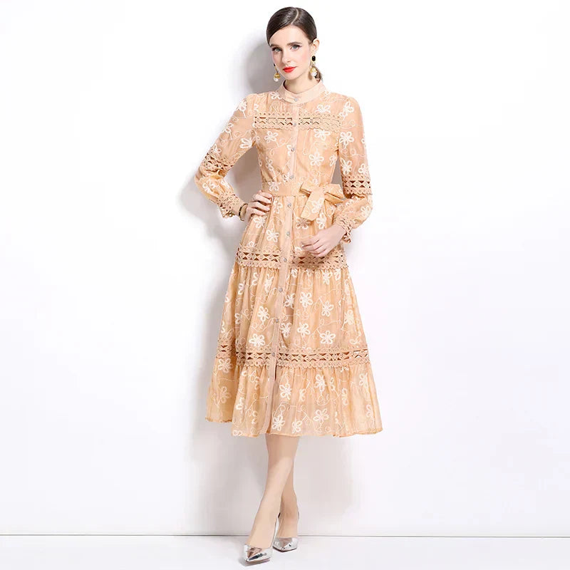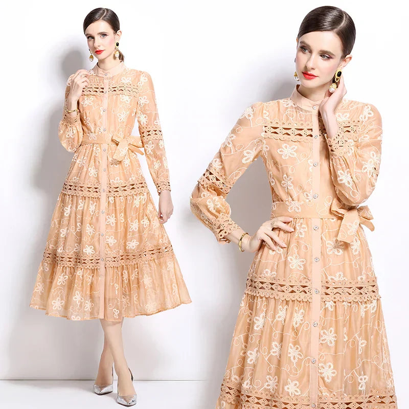 Step into sophistication with Jessica’s Floral Fantasy Dress, featuring exquisite autumn embroidery and delicate lace detailing. With its stylish puff sleeves and single-breasted design, this midi dress is perfect for parties and runway events alike, effortlessly blending comfort and style.