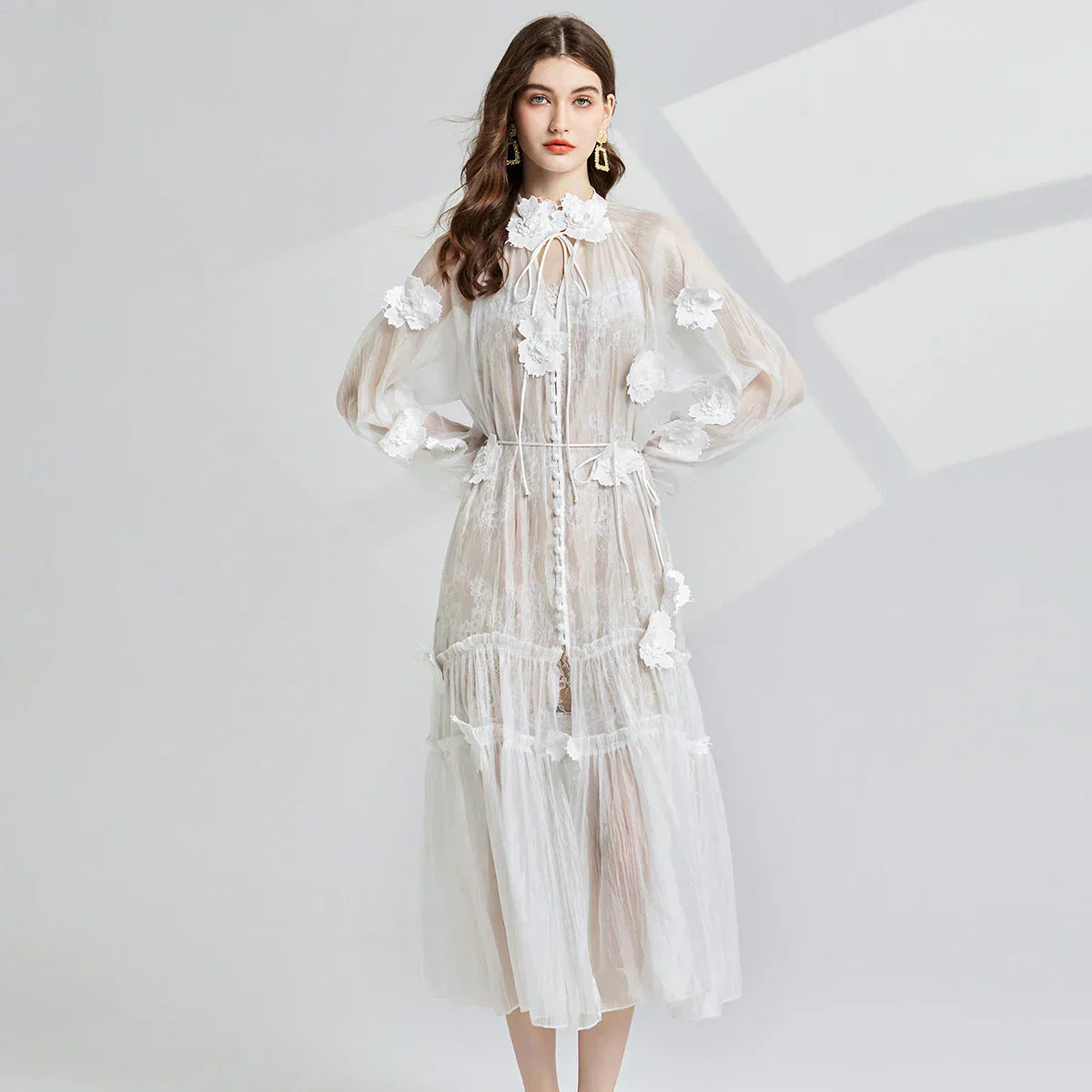 Embrace effortless style in Jessica’s Garden Grace Dress, featuring delicate floral embroidery and flowing ruffles. With its relaxed fit, lantern sleeves, and lace-up detail, this dress is perfect for a chic autumn holiday look.
